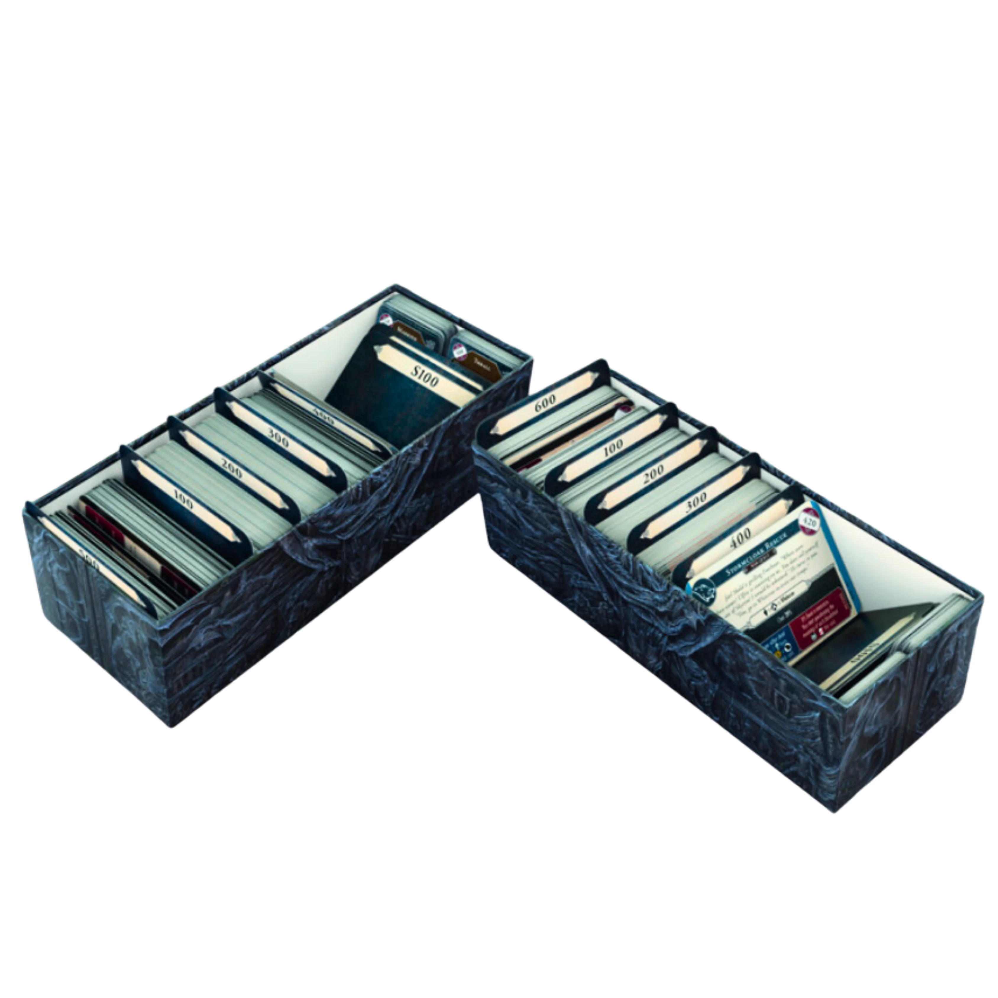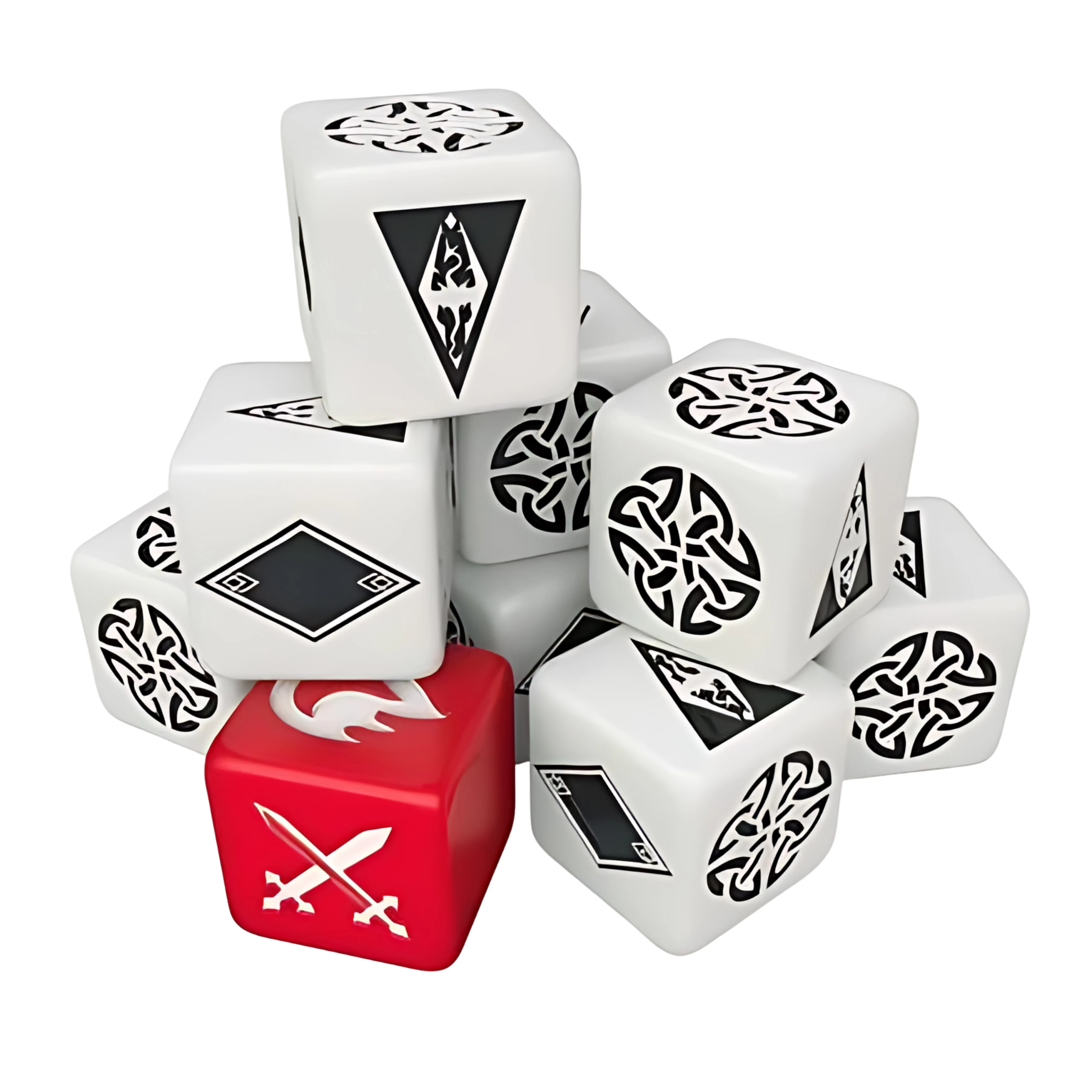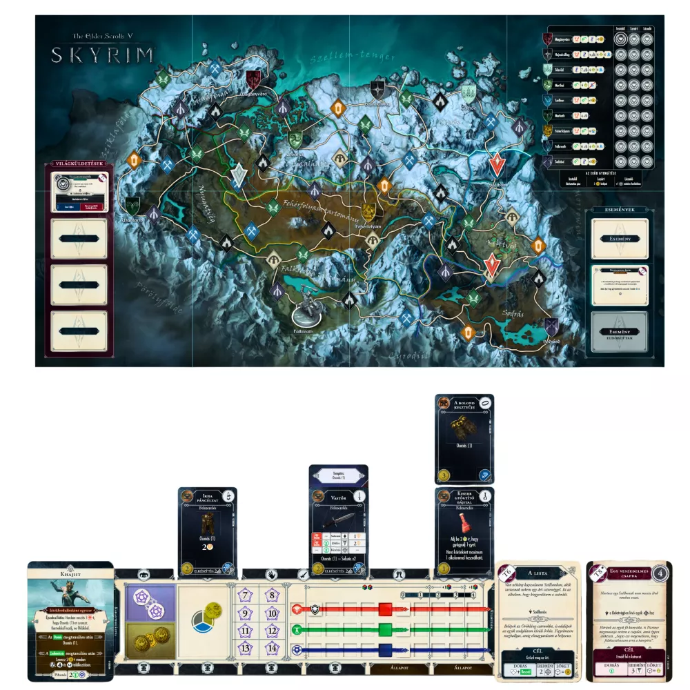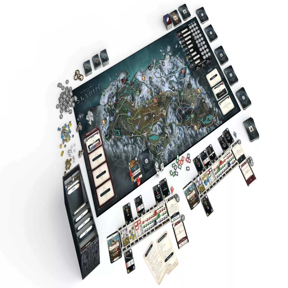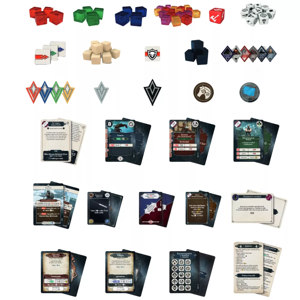 Tartozékok: Játékosfigurák x6, képességpróba-kockák x8, ellenségkocka x1, életerő-jelzőkockák x4, kitartásjelzőkockák x4, varázserő-jelzőkockák x4, páncélzat-jelzőkockák x18, sávkorlát-jelzőkockák x12, végsőcsapás-jelzőkockák x4, képességjelölők x72, tapasztalatjelölők x42, aranyjelölők x42, alkotóelem-jelölők x72, fenyegetésjelölők x100, játékosküldetés-jelzők x12, küldetésjelzők x24, kezdőjátékos-jelölő x1, lójelölők x4, ulfric polgárőrségének jelölője x1, kóborlószörny-jelölők x 34, karaktertáblák x4, játéktábla x1, szabálykönyv x1, oktató-/kampányfüzet x1, küldetéskártyák x297, kazamatakártyák x54, találkozáskártyák x67, követőkártyák x25, karakterkártyák x6, tárgykártyák x196, fejlesztés/bűvöléskártyák x46, állapotkártyák x40, eseménykártyák x68, vadonkártyák x20, településkártyák x20, kazamatakihívás-kártyák x6, segédkártyák x4.