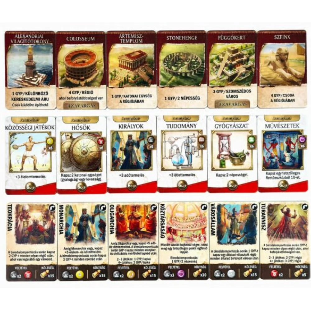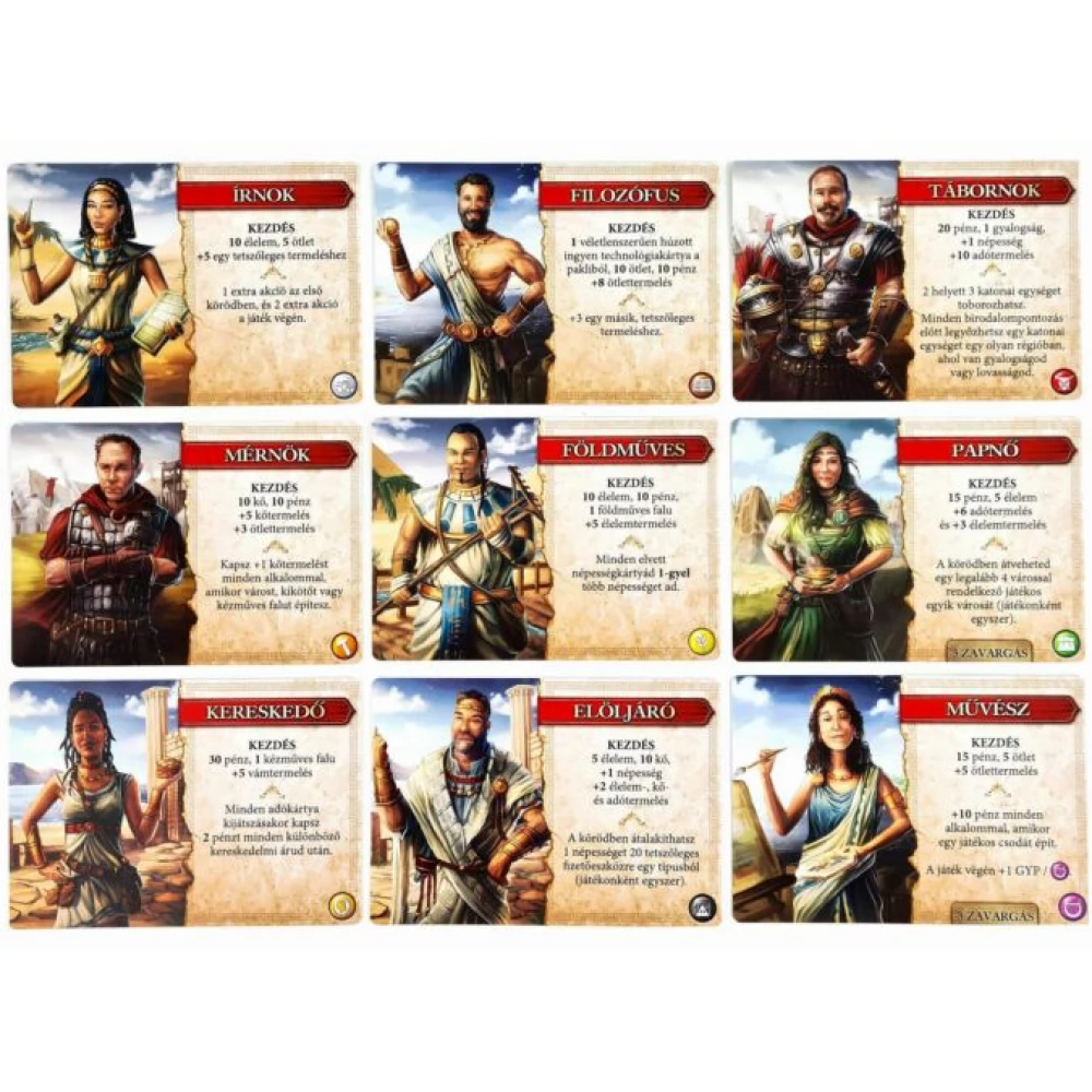 Ahhoz, hogy egy nagy civilizáció létrejöhessen, stabil alapokra van szükség: olyanokra, mint a tudomány, a kormányzat, gazdaság, építészet, mezőgazdaság, harcászat, kultúra vagy a népegészség és városiasodás. A játékban ki-ki erre a kilenc pillérre építi a maga civilizációját, és hogy Te éppen melyik oszlopot teszed igazán erőssé, az csakis rajtad múlik, elvégre a te birodalmadról van szó.