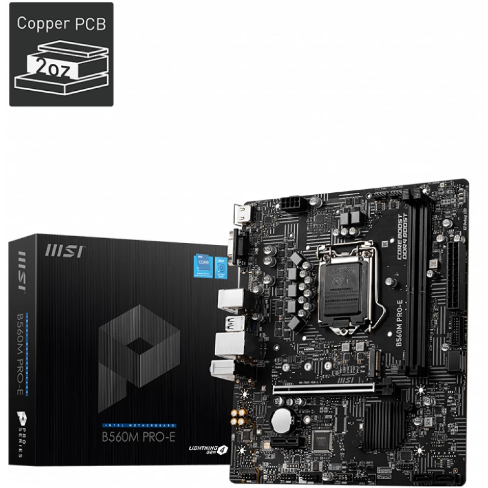 MSI B560M PRO-E típusú alaplap LGA-1200 foglalattal, Intel B560 chipsettel, Processzorban integrált videokártyával, 2 darab DDR4 memóriafoglalattal (max 64GB). 6 darab USB 2.0 port, 4 darab USB 3.0 port.