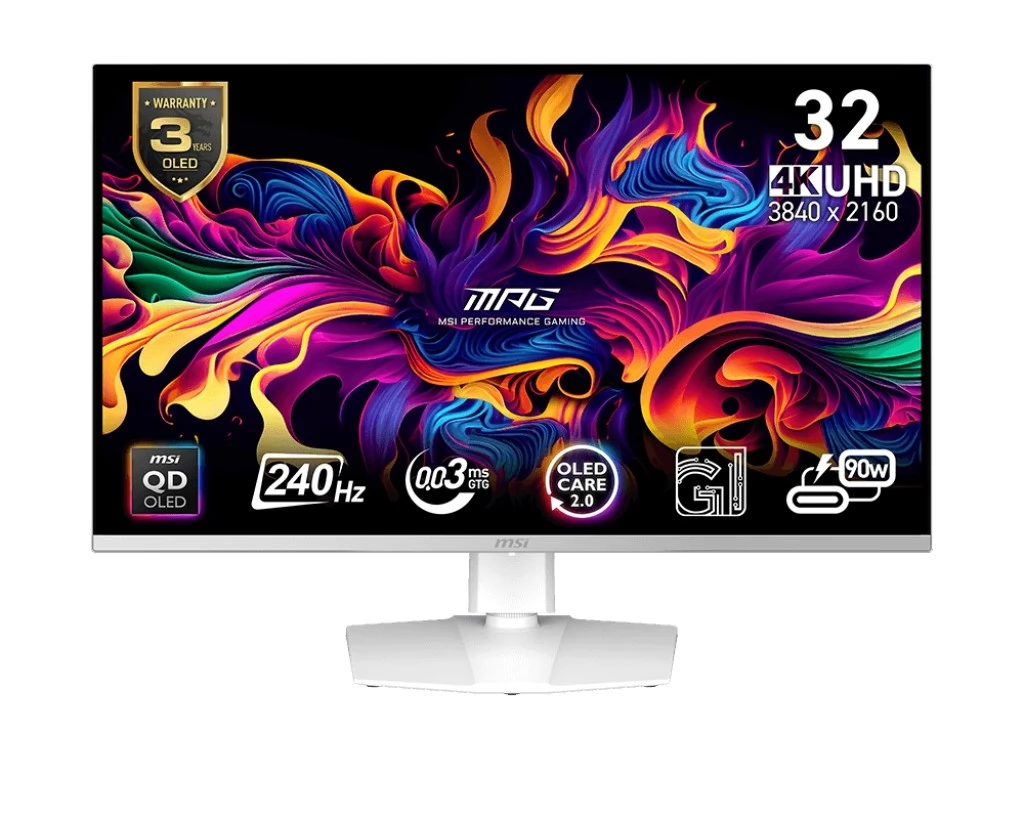 MSI MPG 321URXW típusú 31.5”-es QD OLED paneles Fehér színű GAMER monitor 3840 x 2160 (4K UHD) felbontással.