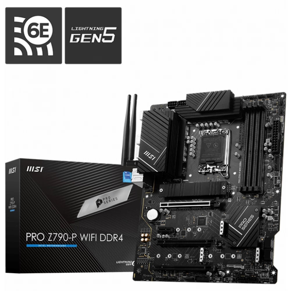 MSI PRO Z790-P WIFI DDR4 típusú alaplap LGA-1700 foglalattal, Intel Z790 chipsettel, Processzorban integrált videokártyával, 4 darab DDR4 memóriafoglalattal (max 128GB). 8 darab USB 2.0 port, 6 darab USB 3.0 port, 2 darab USB 3.1 port.