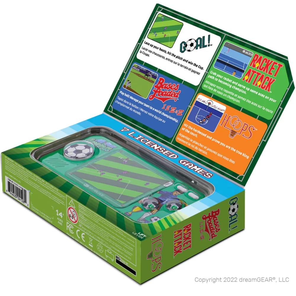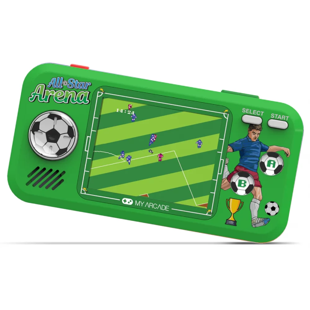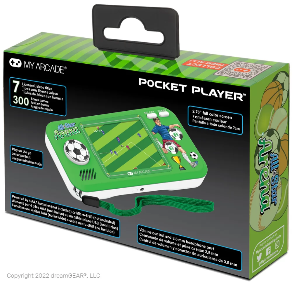 Tartalmazza a GOAL!™, a BASES LOADED™ 1, 2, 3 és 4, a RACKET ATTACK™ és a HOOPS™ teljesen játszható verzióit. Az All-Star Arena Pocket Player® színes, 2,75 hüvelykes képernyővel rendelkezik, amely mind a 7 játékot élénken megjeleníti, és az ergonómiára és a kompakt kialakításra fektetve több órányi játékra finomhangolt.