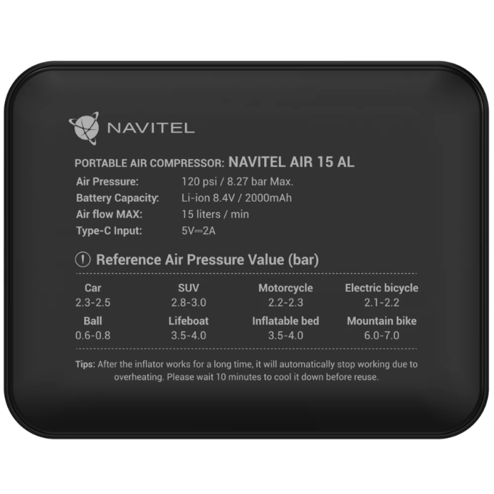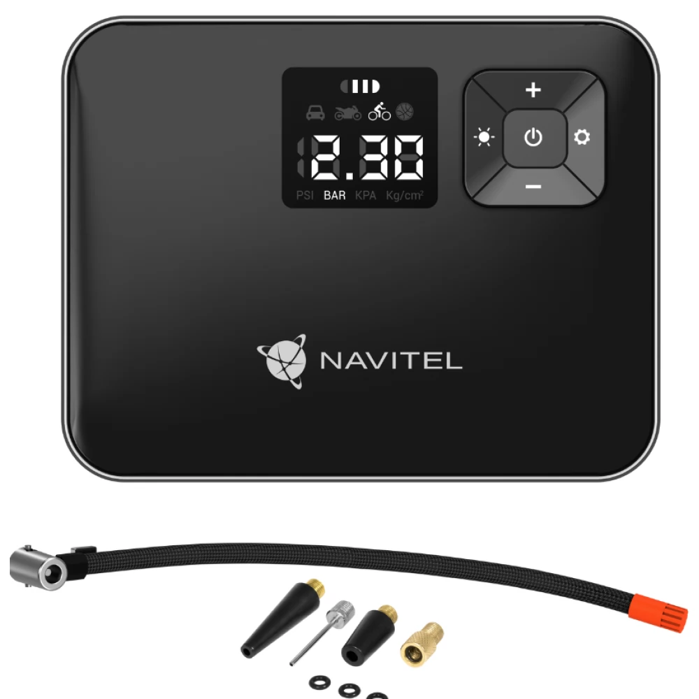 A NAVITEL AIR 15 AL egy újratölthető légkompresszor automatikus nyomásszabályozóval, digitális nyomásmérővel és LCD kijelzővel. Az AIR 15 AL segítségével gond nélkül felfújhatja az autó, kerékpár, motorkerékpár, labda vagy úszójáték kerekeit. A beépített 2000 mAh-s Li-ion akkumulátornak köszönhetően a kompresszor önállóan működik - anélkül, hogy csatlakoztatni kellene egy elektromos aljzathoz vagy a jármű fedélzeti tápegységéhez.