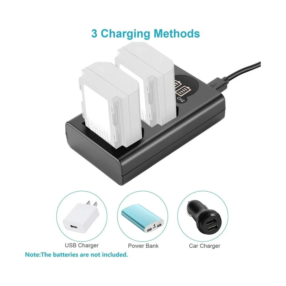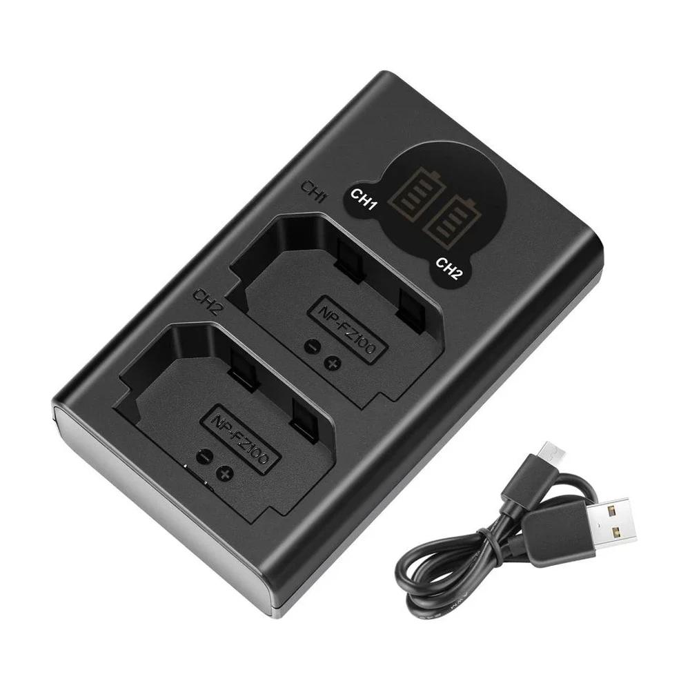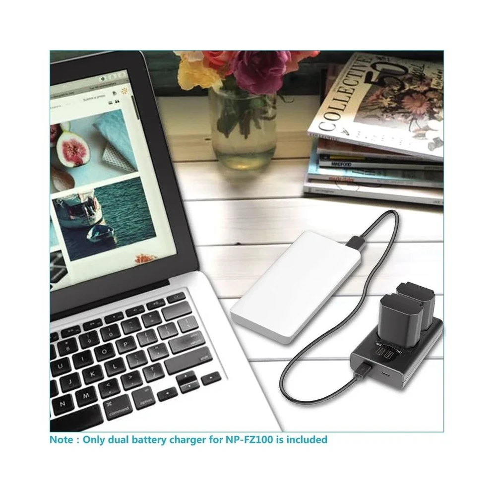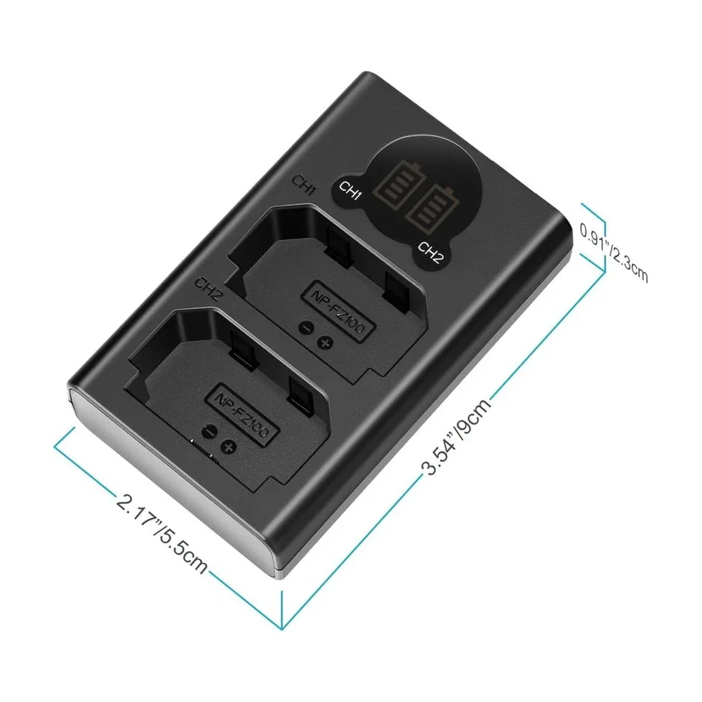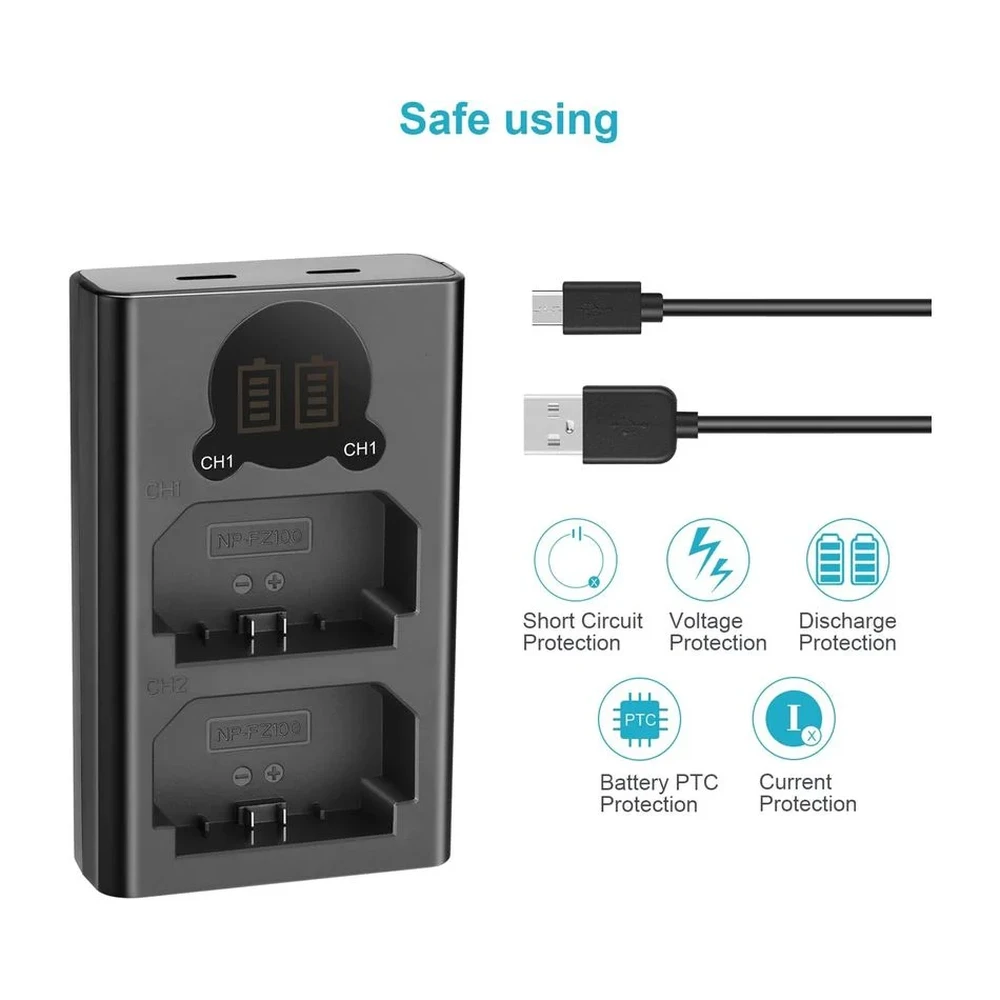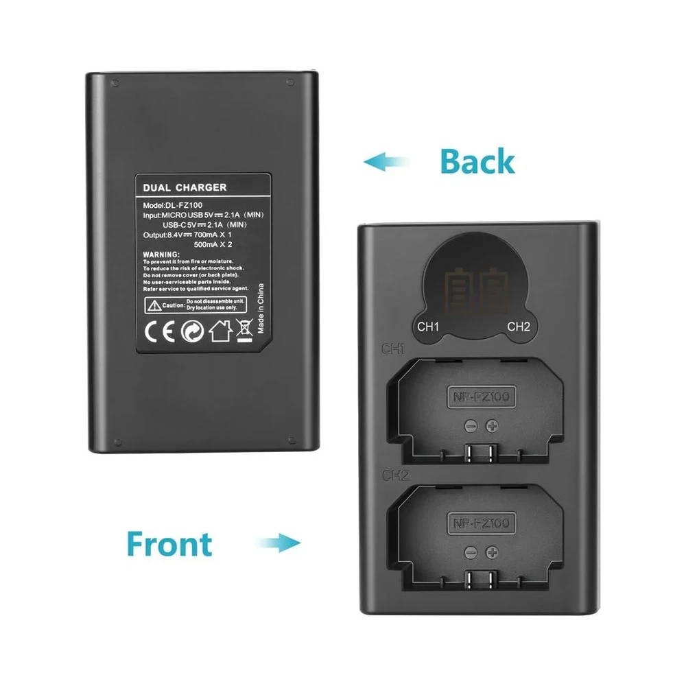 Kettős töltő kompatibilis a Sony NP-FZ100 Li-on akkumulátorral és a Sony ZV-E1, FX3, FX30, A1, A9, A9 II, A7R III, A7R IV, A7R V, A7S III, A7 III, A7 IV, A6600, A7C. Egyszerre 2 db NP-FZ100 akkumulátort vagy csak 1 db akkumulátort tud tölteni.Teljes körű tartalék áramellátási megoldást biztosít. Mindkét akkumulátor egyidejű feltöltése mindössze néhány órát vesz igénybe a micro-USB vagy USB Type-C bemenet segítségével. A hálózati USB-töltővel, mobiltelefon-töltővel, autós töltővel, laptop-töltővel vagy power bankkal történő töltés több lehetőséget biztosít,mint egy hagyományos akkumulátortöltő.