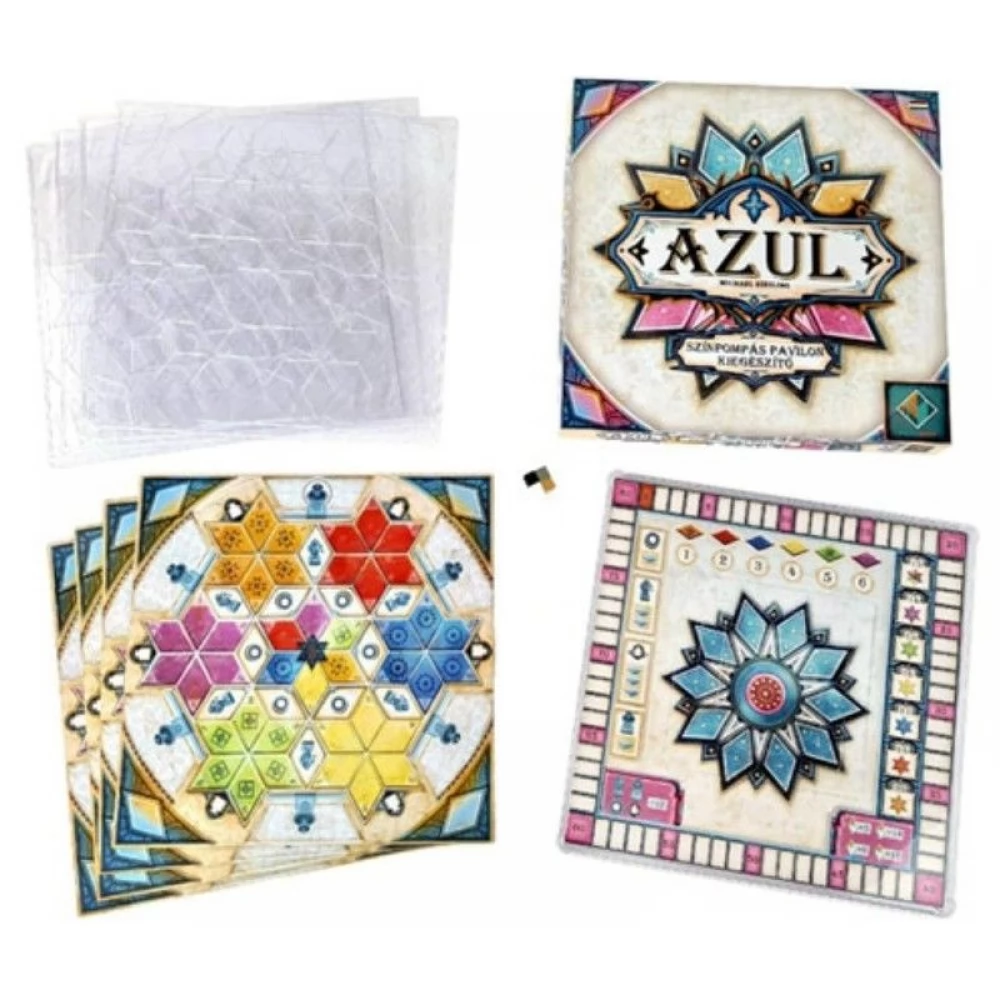 Az Azul Színpompás pavilon kiegészítő tartalmaz két újfajta, érdekes pontozású játékostáblát, illetve műanyag védőket, amelyek megakadályozzák, hogy a csempéink szétcsúszkáljanak.