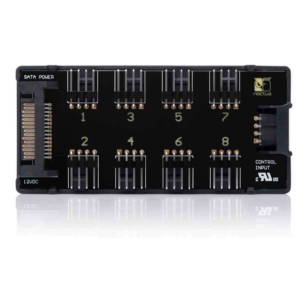 8 portos ventilátor vezérlő, amit lehet PWM csatlakozóról (max 24W) vagy SATA csatlakozó (max 54W) segítségével táplálni. Használható egyszerre is mindkét bemenet, tehermentesítve a PWM bemenetet.