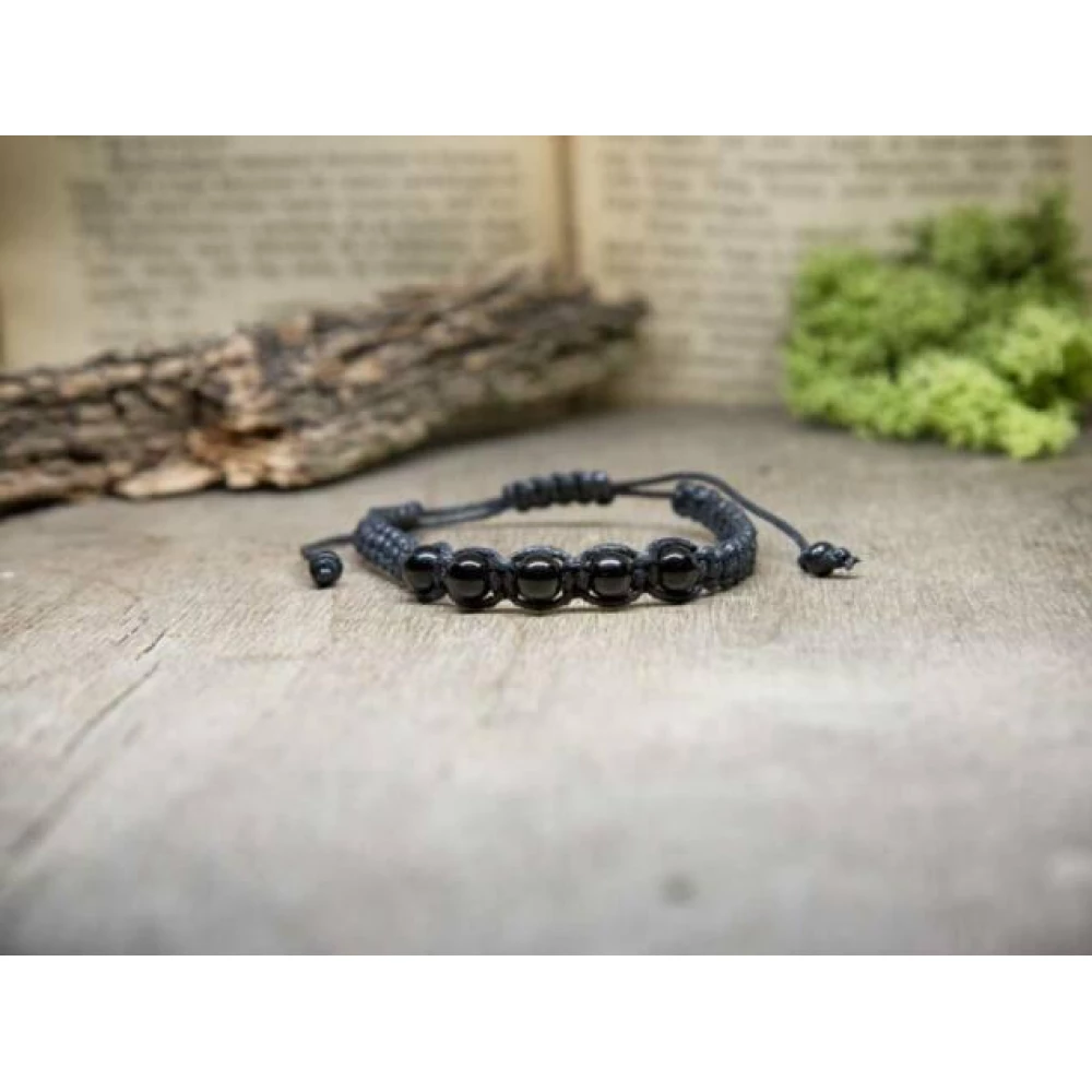 Fekete színű makramé karkötő 5 db ónix ásvány gyönggyel díszítve.