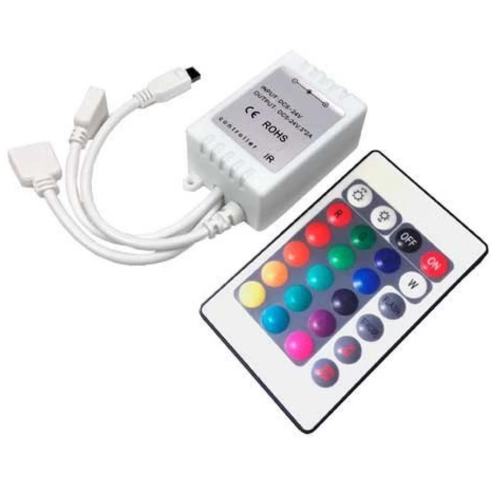 Infravörös működésű, távirányítós vezérlő színváltós RGB led szalaghoz, 24 gombos tasztatúrás távirányítóval. A vezérlő lehetővé teszi, hogy fel vagy le kapcsoljuk a fényt, csökkentsük vagy növeljük a fény erejét, vagy megváltoztassuk annak színét. A vezérlő szetthez tartozó távirányítóval akár 16 különböző színt (3 alapszín és 13 szín, amely az alapszínek keveréke) lehet beállítani, illetve 4 programot a szín megváltoztatásához.