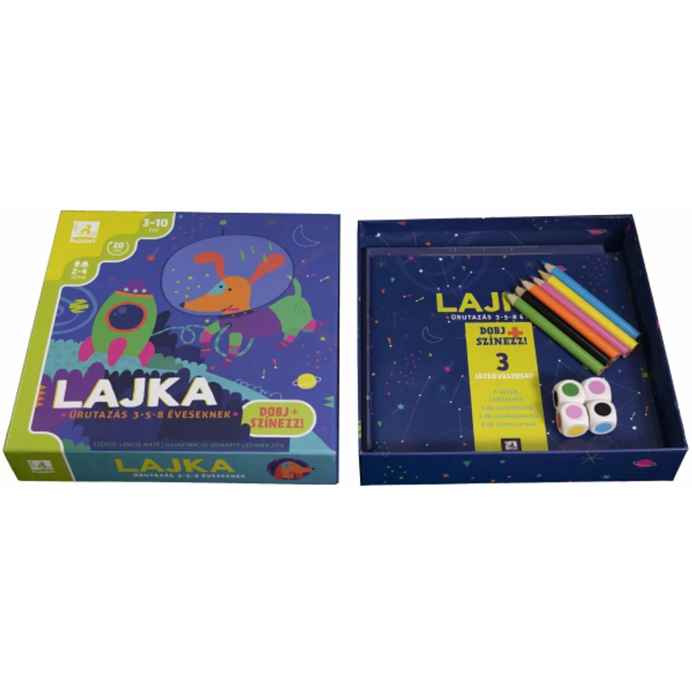 Tarts Lajkával űrfelfedező körútján! Különös űrlényekkel találkozol, űrkukacokat gyűjtesz és megkóstolod az űrkutyaeledelt is. Segítsetek barátaitokkal Lajkának: dobjatok a színes kockákkal, majd színezzétek ki az űrkukacokat, kutyajátékokat és az űrállatokat.