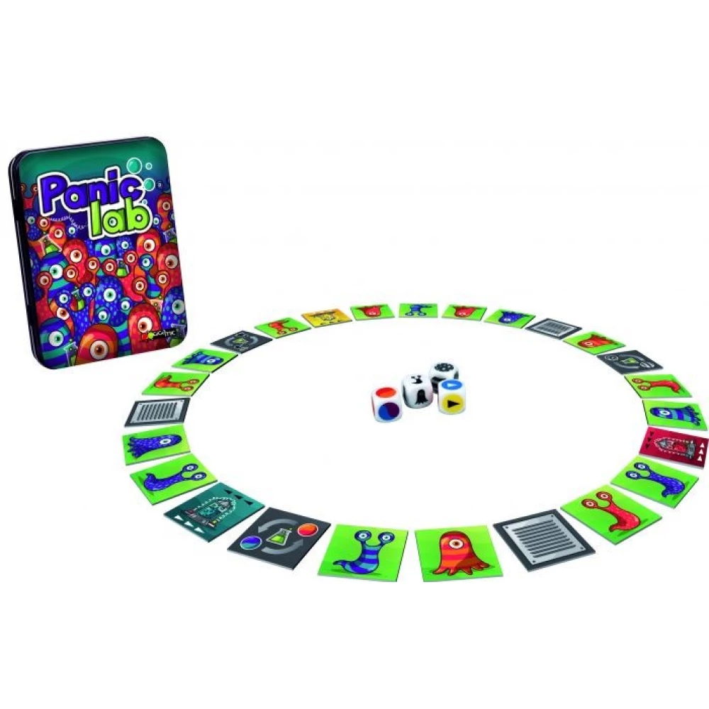 A Panic Lab, mint neve is mutatja a pánikról, a kétségbeesésről szól, de nem a negatív értelemben. Az igényes fémdoboz 25 illusztrált lapkát tartalmaz. Ezeken különböző amőbák láthatóak, amelyek elszabadulnak a laboratóriumban, neked meg az a feladatod, hogy megtaláld a kis csínytevőket. A játék menetét természetesen az is nehezíti, hogy az amőbák elrejtőznek előled a szellőzőnyílásokba, illetve mutálódnak és át is alakulnak. A dobókockák meghatározzák, hogy milyen színű, formájú illetve mintázatú amőbát kell keresned, de idővel ezek a tulajdonságok megváltozhatnak, mert okosak ám azok az amőbák is. Akinek elsőként sikerül megtalálni a keresett amőbát, egy jelzőkártyával gazdagodik. A játékot az a játékos nyeri, akinek először sikerül kigyűjteni 5 jelzőkártyát. Ha kivesszük a szellőző- illetve átváltozáskártyákat, akkor a kisebbek is élvezhetik a játékot. A felnőttek nem csak a különböző amőbákra kell összpontosítsanak, a memóriájukat is kell használniuk, hiszen gyorsan következhetnek be változások, tűnhetnek el amőbák és már rég nem azt kell keresni amit a kockák mutatnak. Ideális családi játék, melyet magunkkal tudunk vinni szinte bárhova a kis mérete miatt, a minőségi kivitelezés pedig lehetővé teszi a használatát akár víz közelében is, mivel egyes lapok enyhén nedvességbíróak.