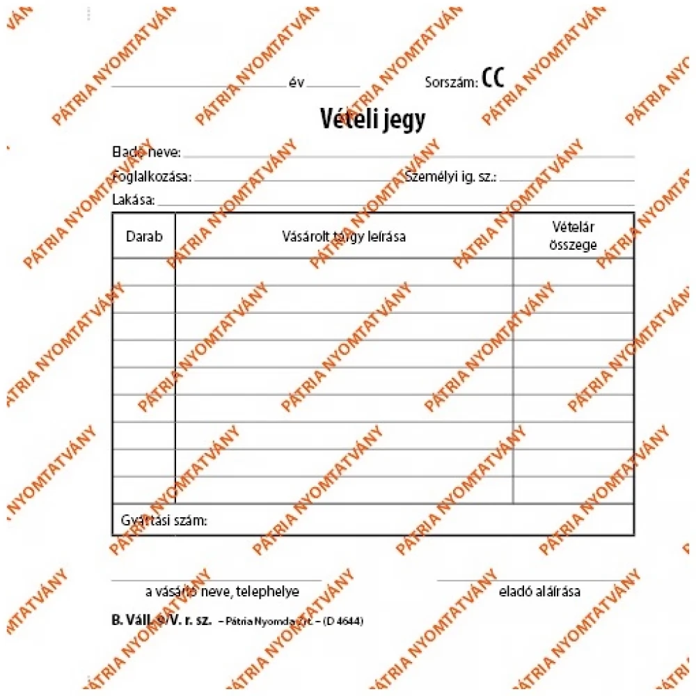 PATRIA B.VALL.9/V 140x140mm 50x2lapos "Vételi jegy" nyomtatvány