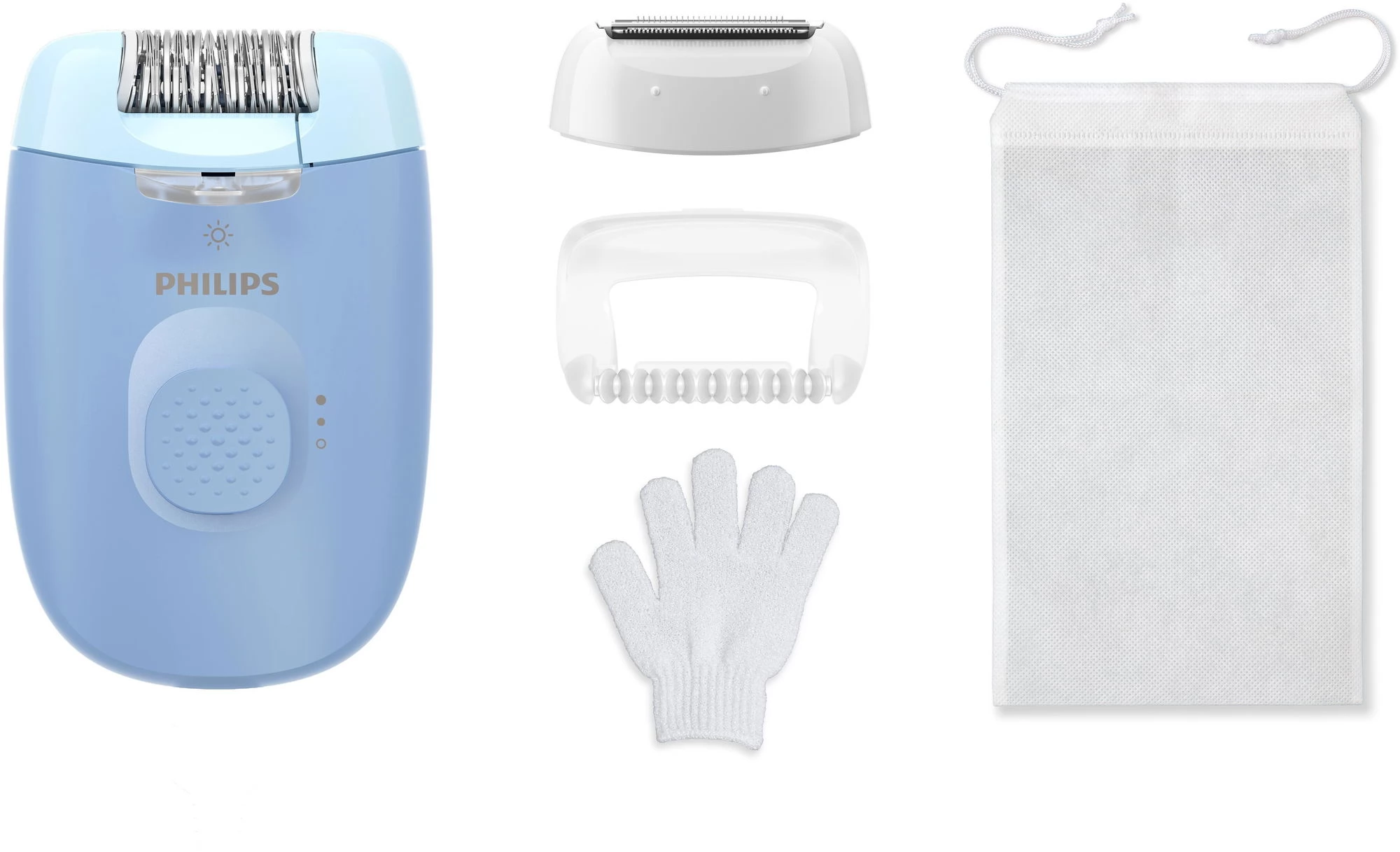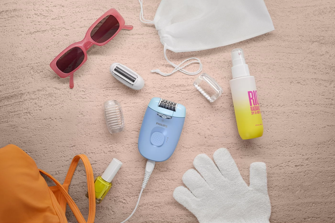 A simaság itt kezdődik. Végezzen hámlasztást, hogy megakadályozza a szőrszálak benövését. A hosszabb szőrszálakat vágja le előre a fésű segítségével a bőr nagyobb kényelme érdekében. Epilálja a kívánt területeket, és a gyengédebb epilálás érdekében pattintsa fel a masszírozósapkát. Amikor pedig úton van, helyezze az epilátort a hordtáskába.