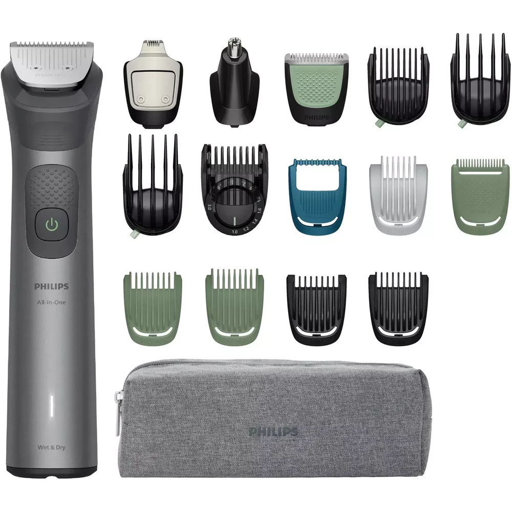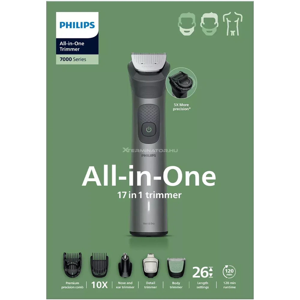 A Philips Series 7000 MG7961/15 egy sokoldalú, 17 az 1-ben multigroomer, amely egyetlen eszközzel lehetővé teszi az arc, test és fej teljes ápolását. A készlet 17 különböző feltétet tartalmaz, amelyekkel precízen alakítható a szakáll, bajusz, köszörülhető a testszőrzet és kezelhető a fülből, orrból kilógó szőr is.