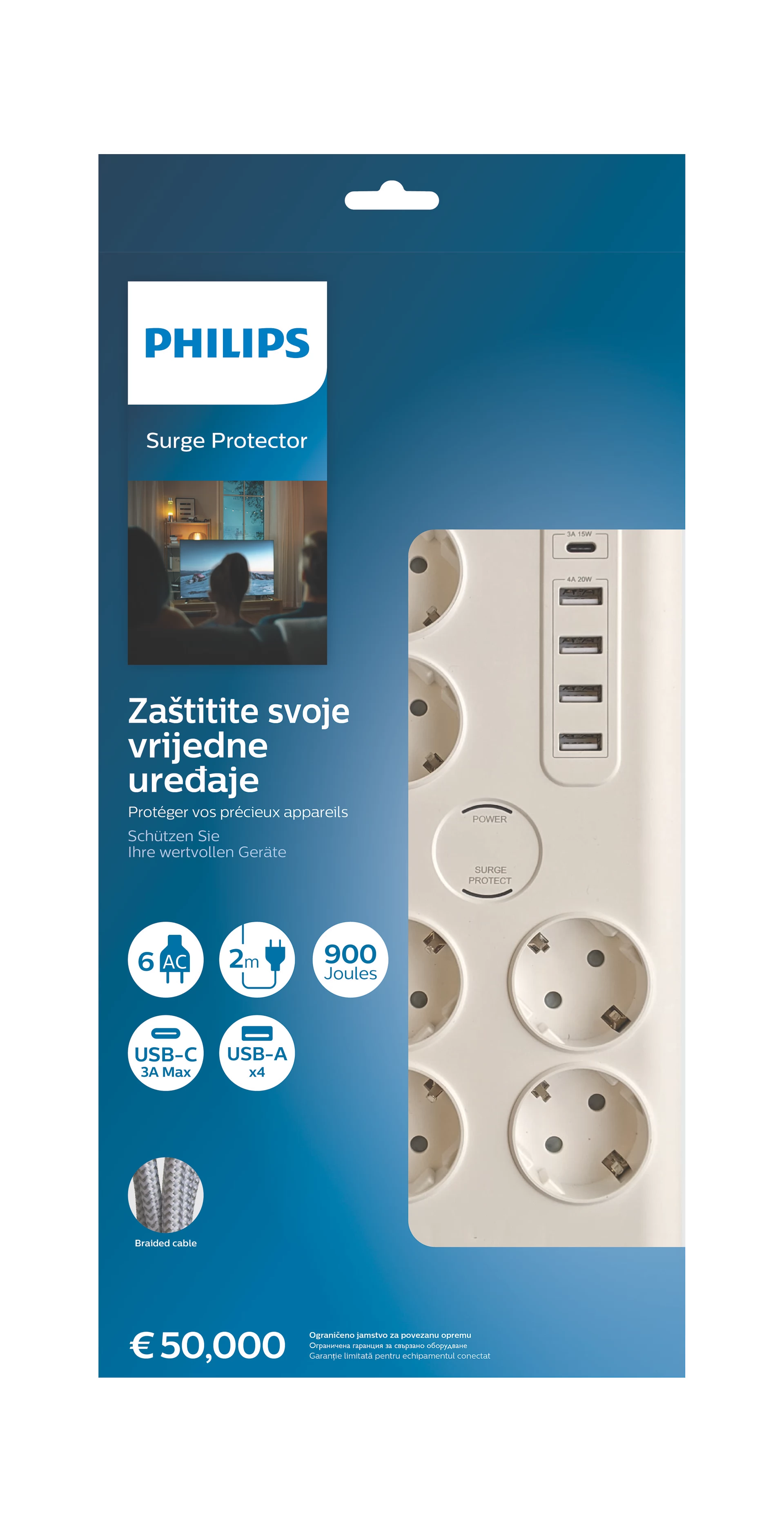 PHILIPS SPN7060WA/58 Elosztó 6 aljzat 5x USB 2m fehér kapcsolós védett