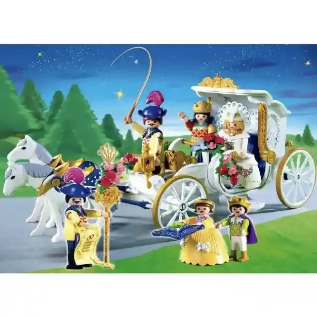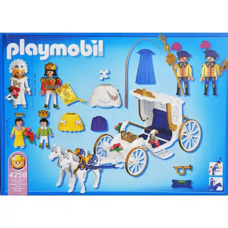 A Playmobil Viktoriánus esküvői hintó egy lenyűgöző játékkészlet, amely lehetővé teszi a gyermekek számára, hogy eljátsszák a királyi udvar életének pillanatait. A készlet tartalmaz egy díszes hintót, két lovat és hat Playmobil figurát, köztük egy herceget és egy hercegnőt. A hintó teteje lehajtható, így könnyen hozzáférhetünk a belső térhez, amely egy kincsesládát rejt a szerelmes levelek számára. A részletesen kidolgozott hintó elegáns megjelenésével és lehajtható tetejével valósághű játékélményt biztosít. A lovak szépen kidolgozottak, és a hintóhoz kapcsolódnak, lehetővé téve a királyi utazások eljátszását.