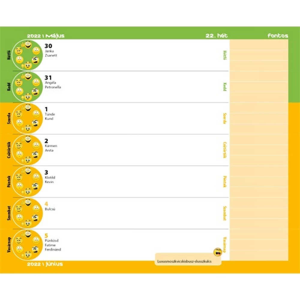 - Terjedelme: 144 oldal, ebből 106 oldal heti beosztású naptár, 38 oldal pedig információs blokk