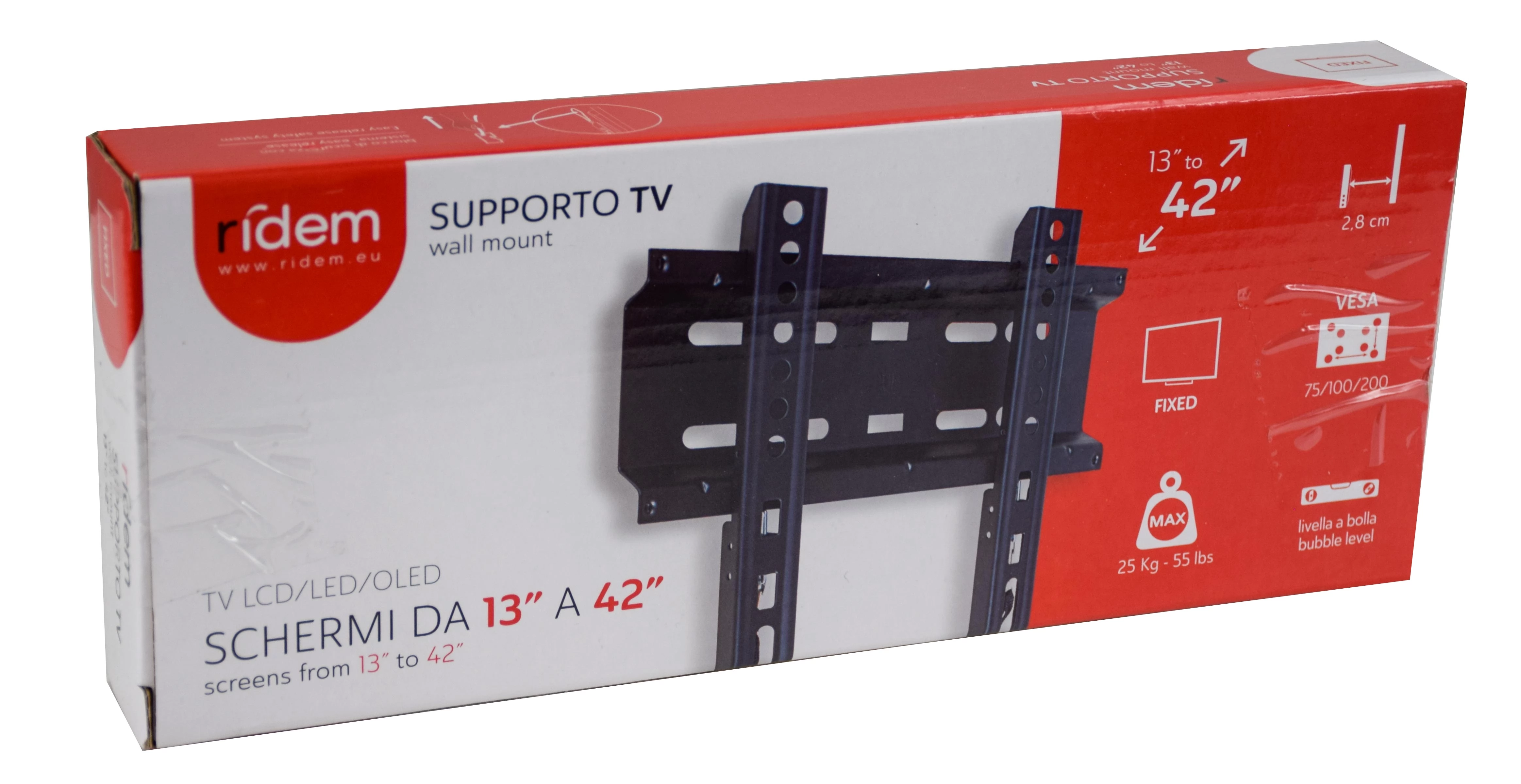 Fém tartó a 13"-tól 42"-ig terjedő TV-képernyők falra szereléséhez. A rögzítés VESA 75*75 200*200, maximális teherbírása 25 kg, a faltól való távolság pedig 28 mm. Gyors rögzítéssel/leválasztással rendelkezik, és tartalmazza az összeszereléshez szükséges csavarokat és távtartókat.