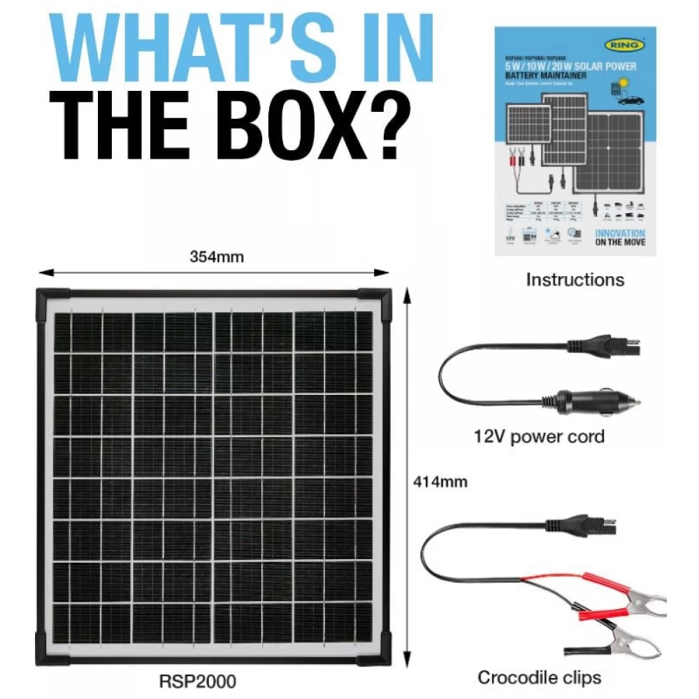 Az RSP2000 egy napelemes akkumulátor-karbantartó 12 V-os járművekhez. Alacsony szén-dioxid-kibocsátású, környezetkímélő módszer a jármű akkumulátorának karbantartására használaton kívül. Ideális szezonálisan használt járművekhez, például lakókocsikhoz, klasszikus autókhoz, motorkerékpárokhoz és golfkocsikhoz. Egyenáramú tápcsatlakozóval és akkumulátorkapcsokkal szállítva, borús körülmények között is működik és vízálló. A fordított polaritás elleni védelem megakadályozza a károsodást, ha a csipeszeket az akkumulátor nem megfelelő pólusaira csatlakoztatják.