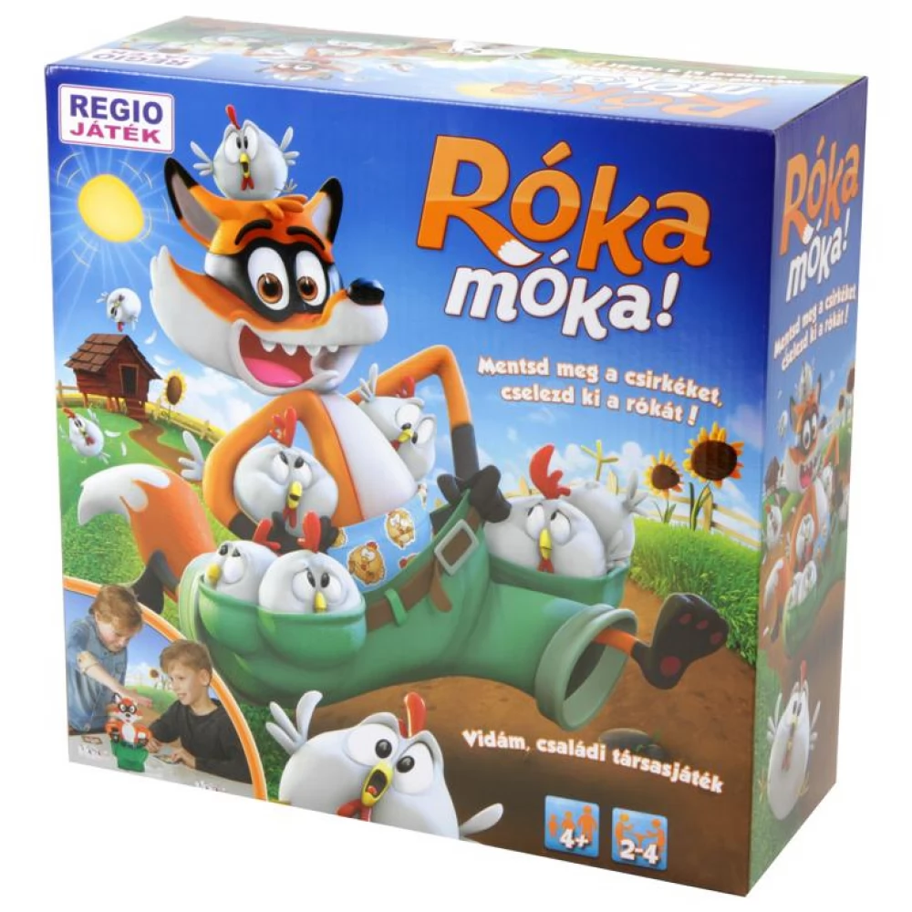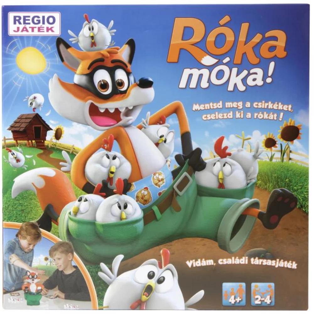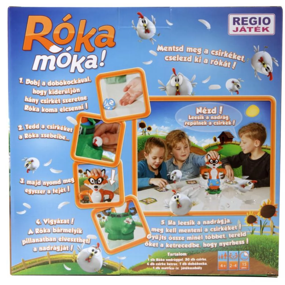 A Róka Móka társasjáték egy vidám családi játék, amiben a róka koma épp a csirkékkel kíván meglógni a farmról. Dobj a dobókockával, hogy megtudd, a róka hány csirkét szeretne elcsenni, majd tedd a csirkéket a róka zsebeibe. Nyomd le a fejét, és figyelj, mert a Róka koma bármikor elveszítheti a nadrágját. Ilyenkor a csirkék kirepülnek, aki a legtöbb csirkét elkapja, megnyeri a játékot!