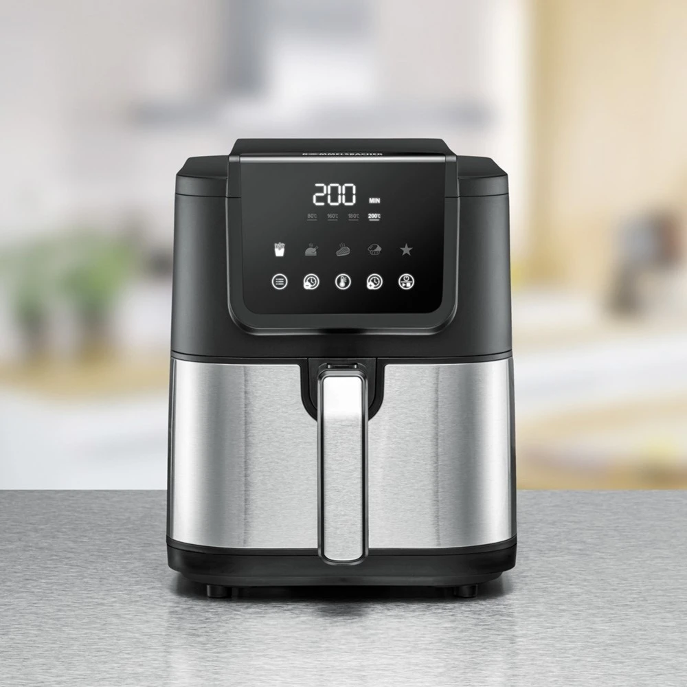 Öt előre programozott funkció (hasábburgonya, csirke, grillezés, sütés, kedvenc) és 4 hőmérséklet-fokozat (80°-200°C) között választhat. A LED kijelzős érintésvezérlés és 60 perces időzítő megkönnyíti a használatot.