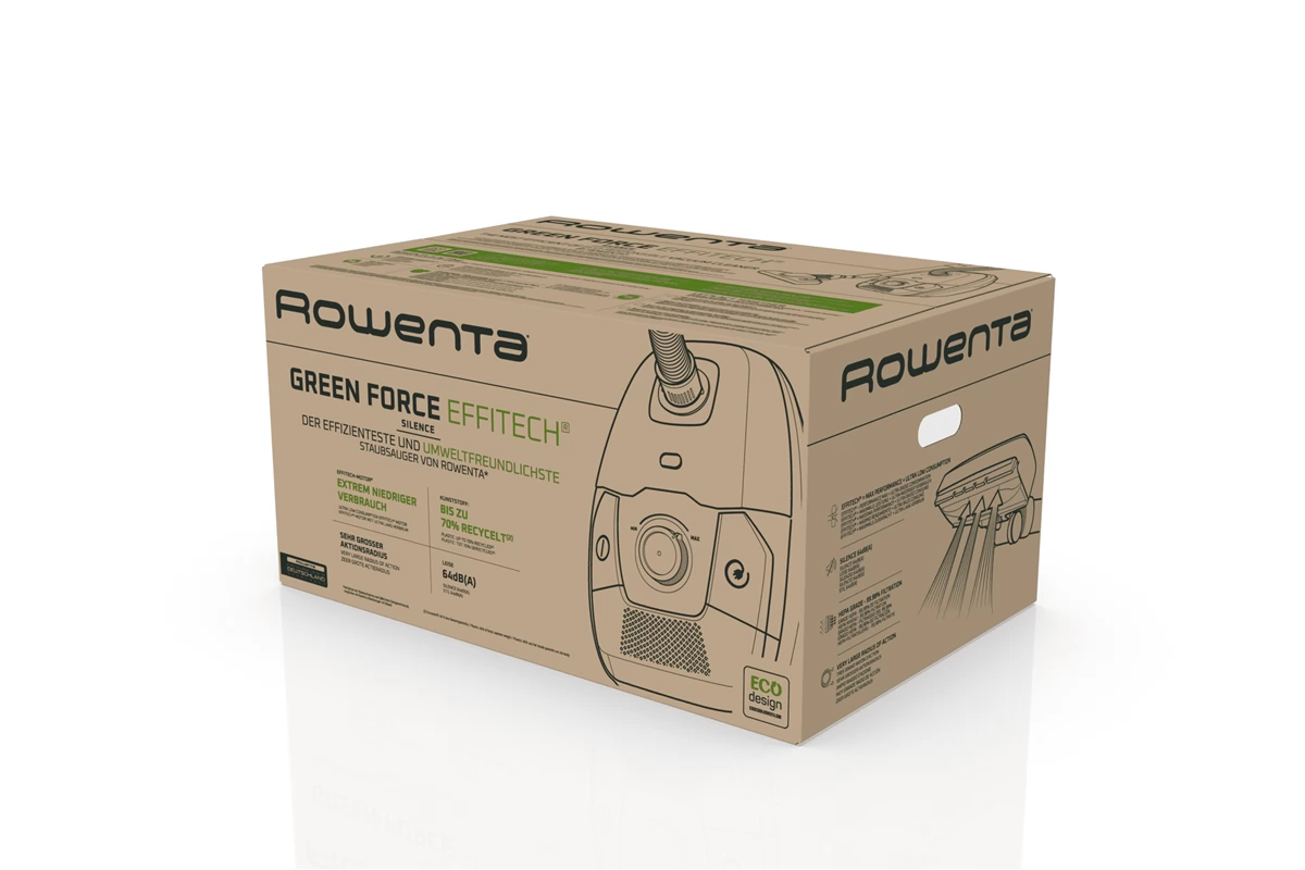 Fedezze fel a Rowenta Green Force Effitech ECO 400W porszívót. Ez a nagy teljesítményű porszívó rendkívül alacsony fogyasztású Effitech® motorral van felszerelve a tökéletes eredményekért, alacsonyabb energiafogyasztás mellett. Rendkívül csendes működése mellett a HEPA-osztályú szűrésnek köszönhetően egészségesebb és higiénikusabb környezetet biztosít. Mindezt egy olyan készülékben találja meg, amely akár 70%-ban újrahasznosított műanyagból* készült, környezetbarát csomagolással.
