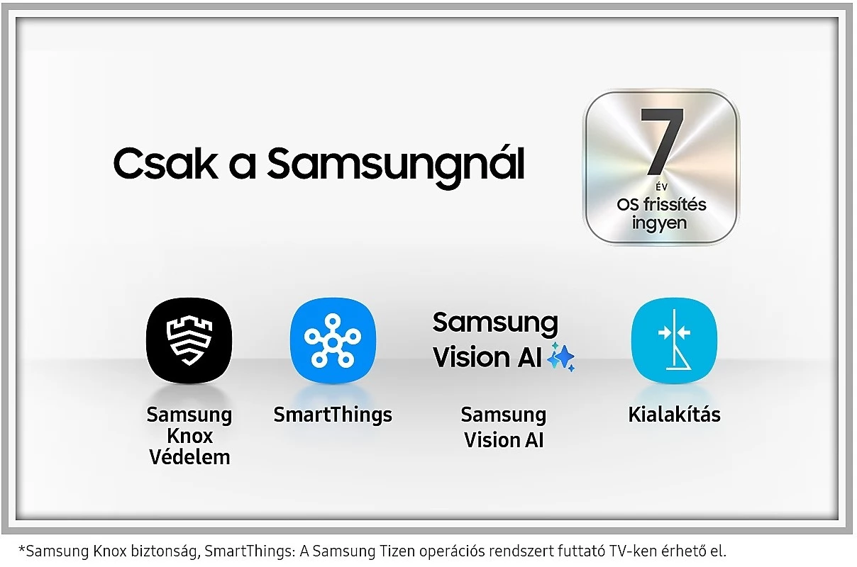 A One UI Tizen személyre szabott képernyőélményt nyújt. A Samsung Tizen operációs rendszer segítségével a legújabb innovatív Samsung funkciókat kínálja. Az élmény biztonságáért a Samsung Knox felelős, amely SmartThings eszközeidet védi. Ráadásul a One UI Tizen a következő 7 évben támogatja a Tizen OS frissítéseket.