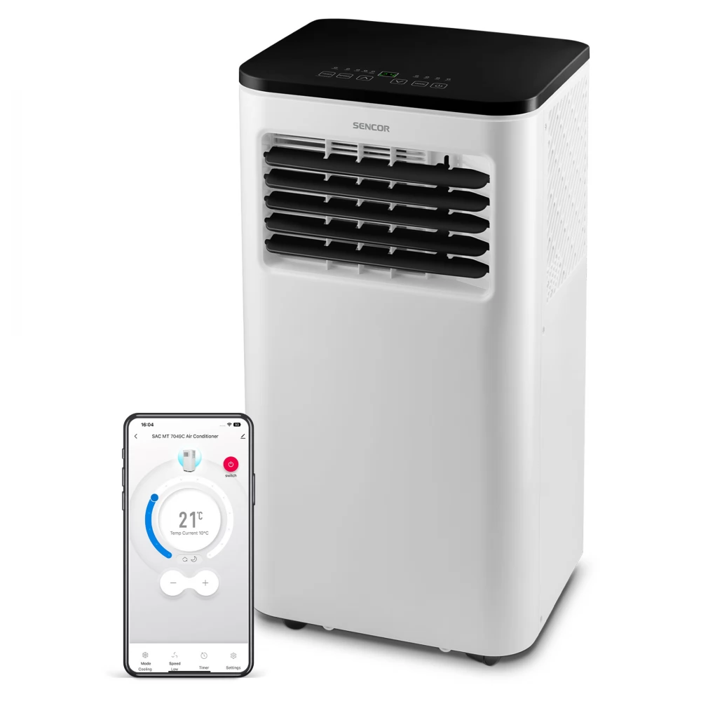 A Sencor SAC MT7049C mobilklíma a nyári napokon hűtésre és a helyiség levegőminőségének javítására is szolgál. 7000 BTU/h hűtőteljesítményének köszönhetően 21-26 m2 helyiségekben és irodákban használható. Akár a Wi-Fi-n keresztüli intelligens Sencor HOME applikációnak köszönhetően irányítható. Három mód közül választhat: Hűtés, Párátlanítás és Ventilátor. Lehetősége van beállítani az időzítő funkcióval be és kikapcsolási időpontot.