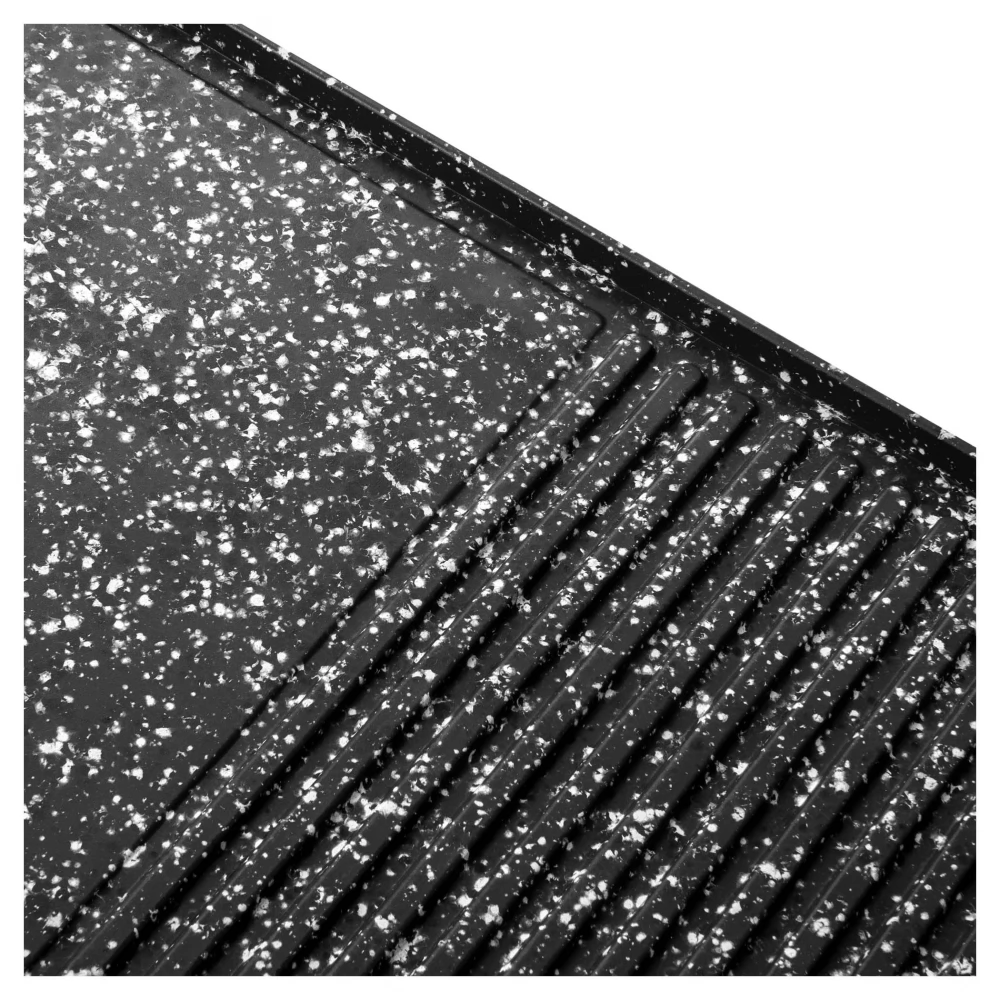 Az osztott kialakítású sütőlap, rendelkezik egy sima felülettel a zöldségek grillezéséhez illetve a bordázott felületen különböző húsok süthetőek.