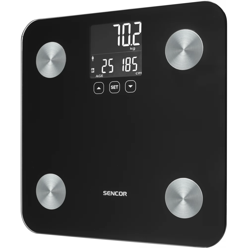 A Sencor SBS 6026BK letisztult, elegáns stílusú minden fürdőszobába könnyen beilleszthető kiegészítő. Képes a mért tömeg, a testvíztartalom, a zsírszázalék, valamint a csontsűrűség kijelzésére, mindemellett meghatározza a testtömeg index értékét is. Rozsdamentes acél lépőfelülettel lett ellátva, a maximális terhelhetősége pedig 180 kg. A kék színű világítással rendelkező inverz kijelző automatikusan ki- és bekapcsol, így használata rendkívül egyszerű.