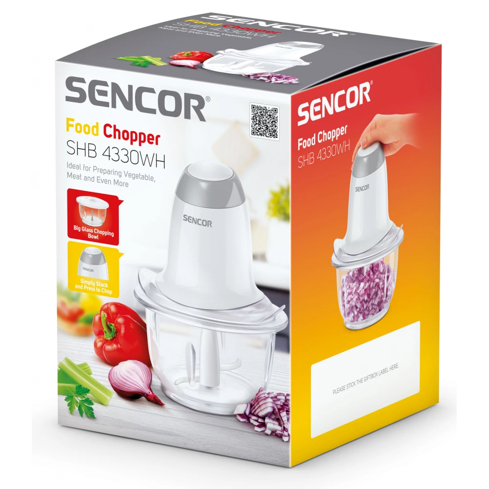A Sencor SHB 4330WH két rozsdamentes acélból készült pengével ellátott élelmiszer aprító készülék. Különféle húsokat, zöldségeket, gyümölcsöket, fűszernövényeket apríthat. Kiválóan alkalmas pürék vagy bébiételek elkészítésére. Az 1 literes térfogatú üvegedény gond nélkül mosható mosogatógépben is. A csúszásgátló talpak biztosítják a stabil munkavégzést.