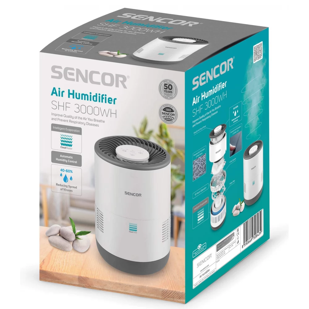 A Sencor SHF 3000WH párásító készülék a magas frekvenciájú ultrahangos oszcillátor elvén működik. A légzés megkönnyítése érdekében hideg párát termel, de nem befolyásolja a helyiség hőmérsékletét. Rendkívül csendes működésének köszönhetően, a hálószobákba is alkalmas. Teljesítményét az intelligens levegő párásító CloudMaster biztosítja, fa készülék szállítása és feltöltése egyszerű. A kettős védelmet fényjelzés biztosítja. Automatikusan kikapcsol a víz kiürülése és a víztartály kivétele esetén is. A vízkő képződést egy speciális szűrő gátolja meg.