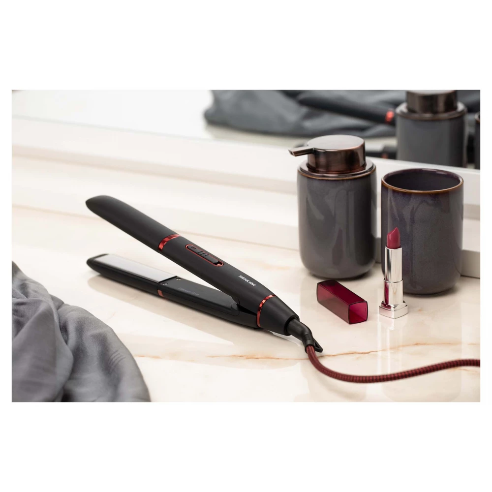 A Sencor SHI 1100BK hajvasaló titán bevonatú vasaló lapjait úgy tervezték, hogy maximális hajsimító hatást érjen el a simítófelület teljes hosszában, így ragyogó fényt biztosít a hajnak. A készülék slim kialakításának köszönhetően nem csak tökéletesen sima, hanem göndör frizura is könnyen elkészíthető. A gyors felmelegedést – akár 220° C hőmérsékletig- a PTC technológia biztosítja. A 360° forgó kábel az összegabalyodás, illetve megtörés ellen biztosít védelmet.