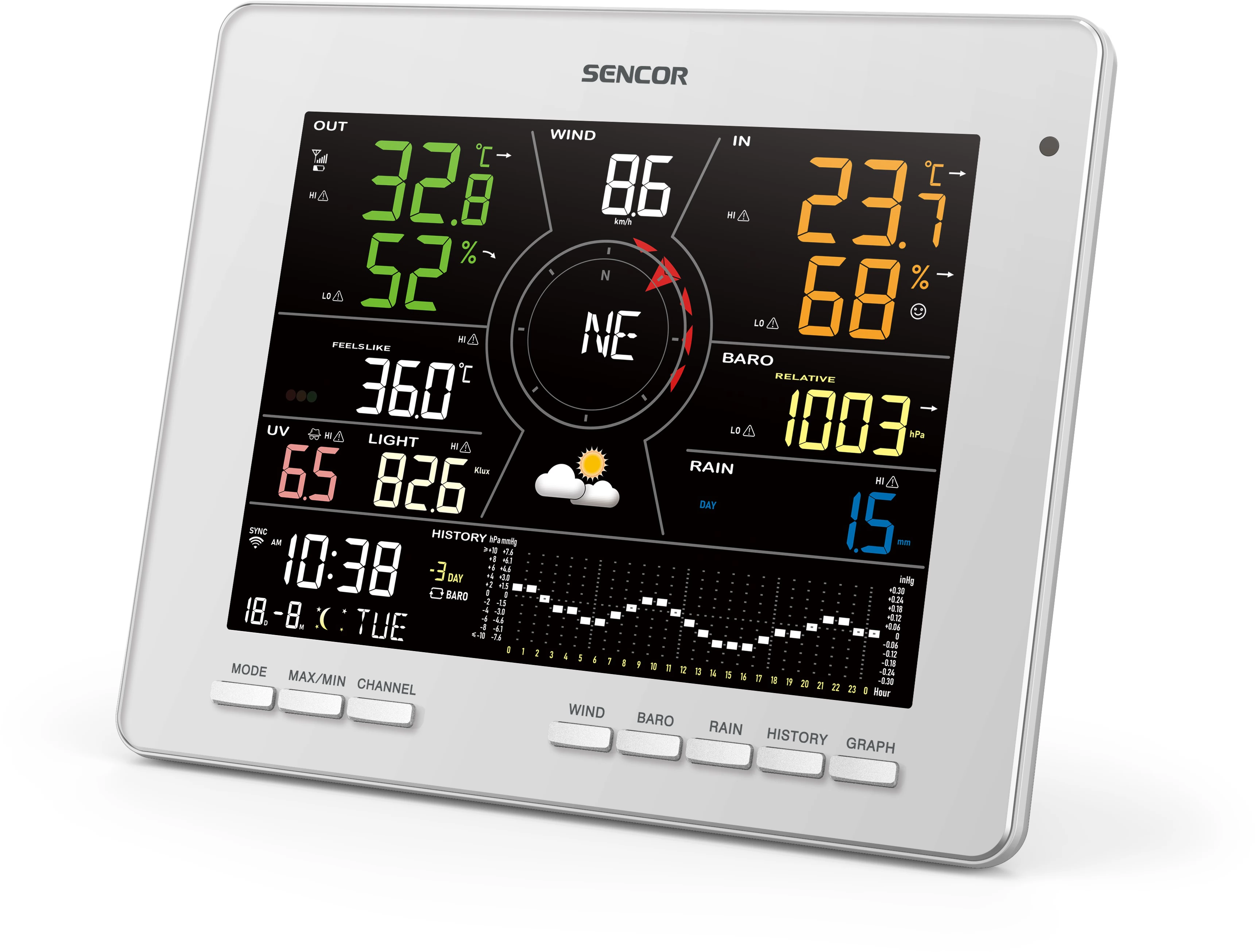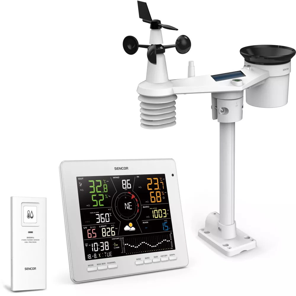 A Sencor SWS 16600 WiFi időjárás állomás innovatív 7 az 1-ben vezeték nélküli érzékelője kiemelkedő pontossággal méri a legfontosabb időjárási paramétereket. Az érzékelő a szélirányt és sebességet, hőmérsékletet, csapadékot, páratartalmat, valamint az UV-sugárzást és a fényintenzitást egyaránt képes rögzíteni. A svájci Sensirion érzékelők megbízhatósága és pontossága garantálja, hogy mindig a legpontosabb adatokat kapd. A TH érzékelő pedig tökéletesen kommunikál a főegységgel akár 150 méteres távolságból is, így a mérési pontokat rugalmasan elhelyezheted.