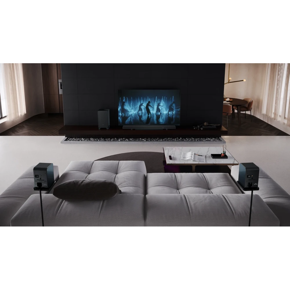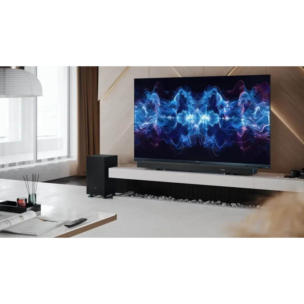 Az innovatív vezeték nélküli mélynyomó moziszerű élményt nyújt vezetékek nélkül. Emellett a különleges irányított hangzás rendszere 2 felfelé sugárzó és 2 oldalra sugárzó hangszórót alkalmaz. A minőségi hangzásért a HDMI eARC/CEC csatlakozást is nyújtja, amely lehetővé teszi a Soundbar vezérlését a TV távirányítójával.