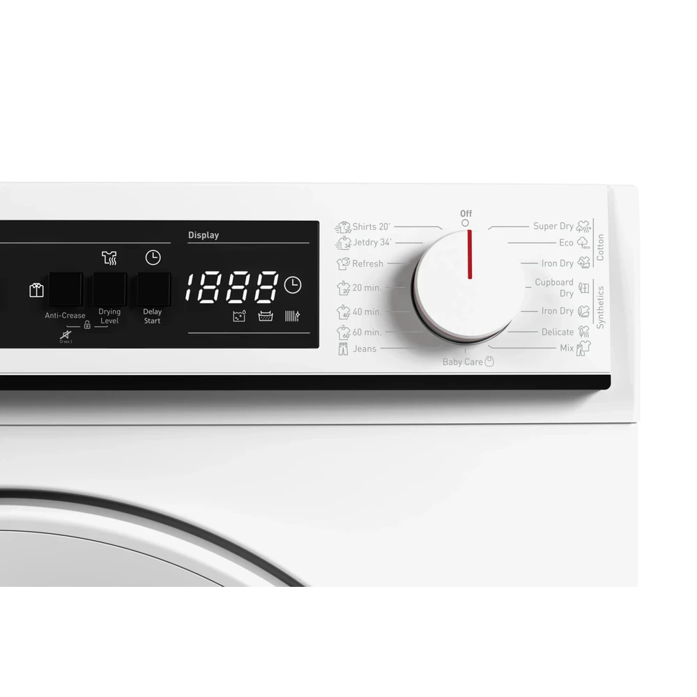 A szárítógép modern LED kijelzővel és egyszerű elektronikus vezérléssel rendelkezik, így könnyen áttekinthető a hátralévő idő, a program és a jelzők állapota. A széles ajtónyílás, dobvilágítás és állítható lábak biztosítják a kényelmes használatot.