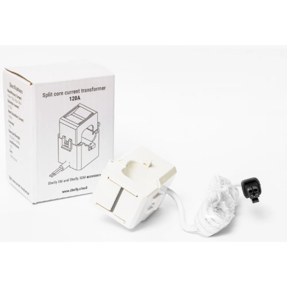 A Shelly 120A-es, vezetékre húzható áramváltója a Shelly EM egyfázisú fogyasztásmérő külön rendelhető kiegészítője.