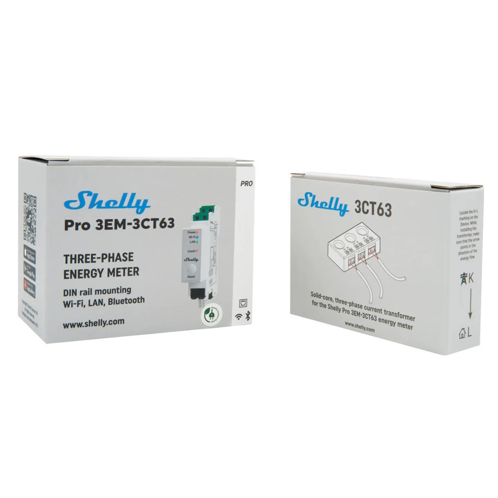 A Shelly Pro 3EM-3CT63 egy DIN-sínre szerelhető, egy- vagy háromfázisú energiamérő, mely képes helyi hálózaton (LAN / Wi-Fi) önállóan működni, vagy felhőalapú automatizálási rendszerekhez is csatlakozhat Modbus, MQTT, HTTPS vagy WebSocket protokollon keresztül, TLS titkosítással.