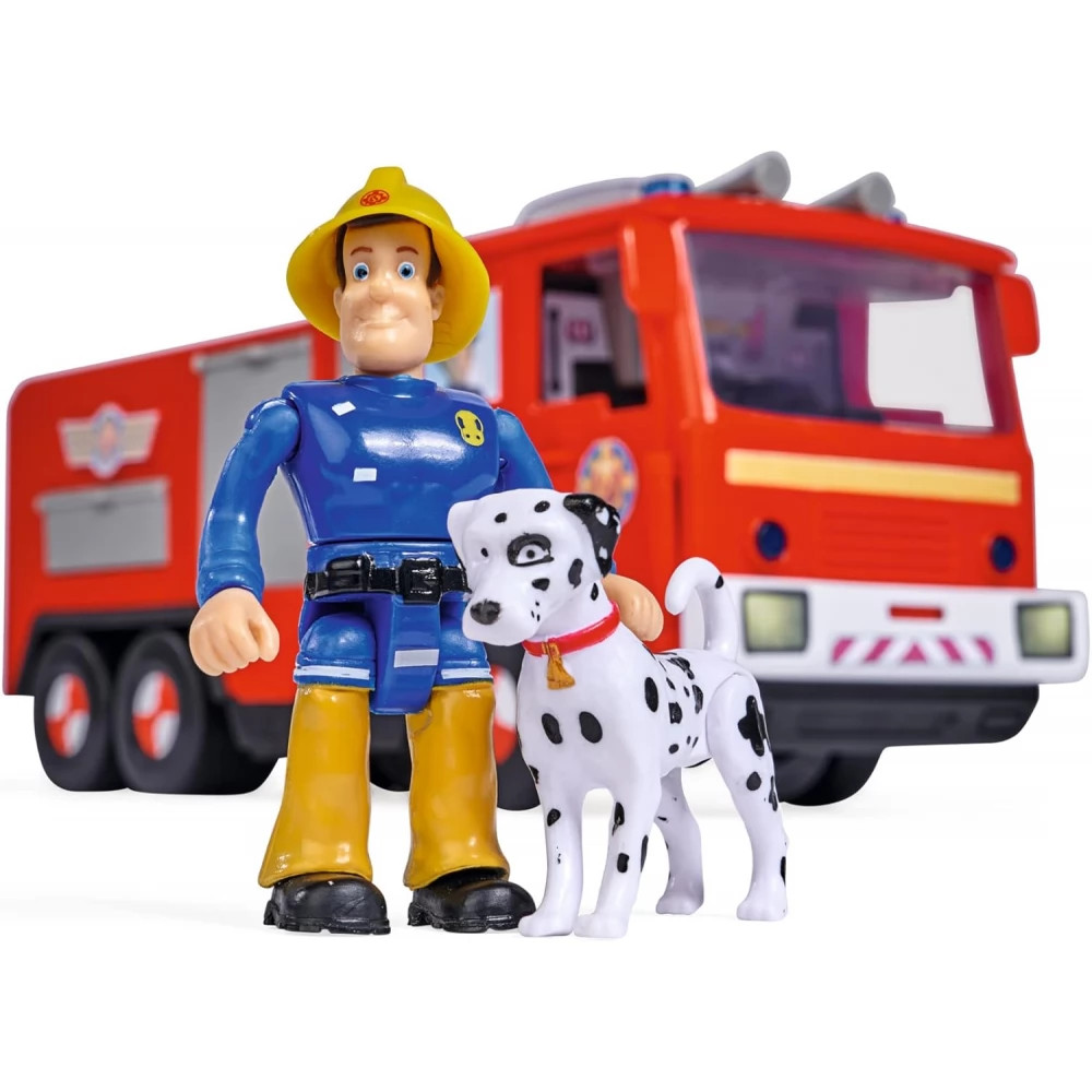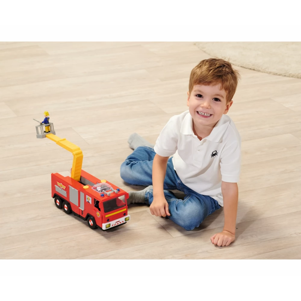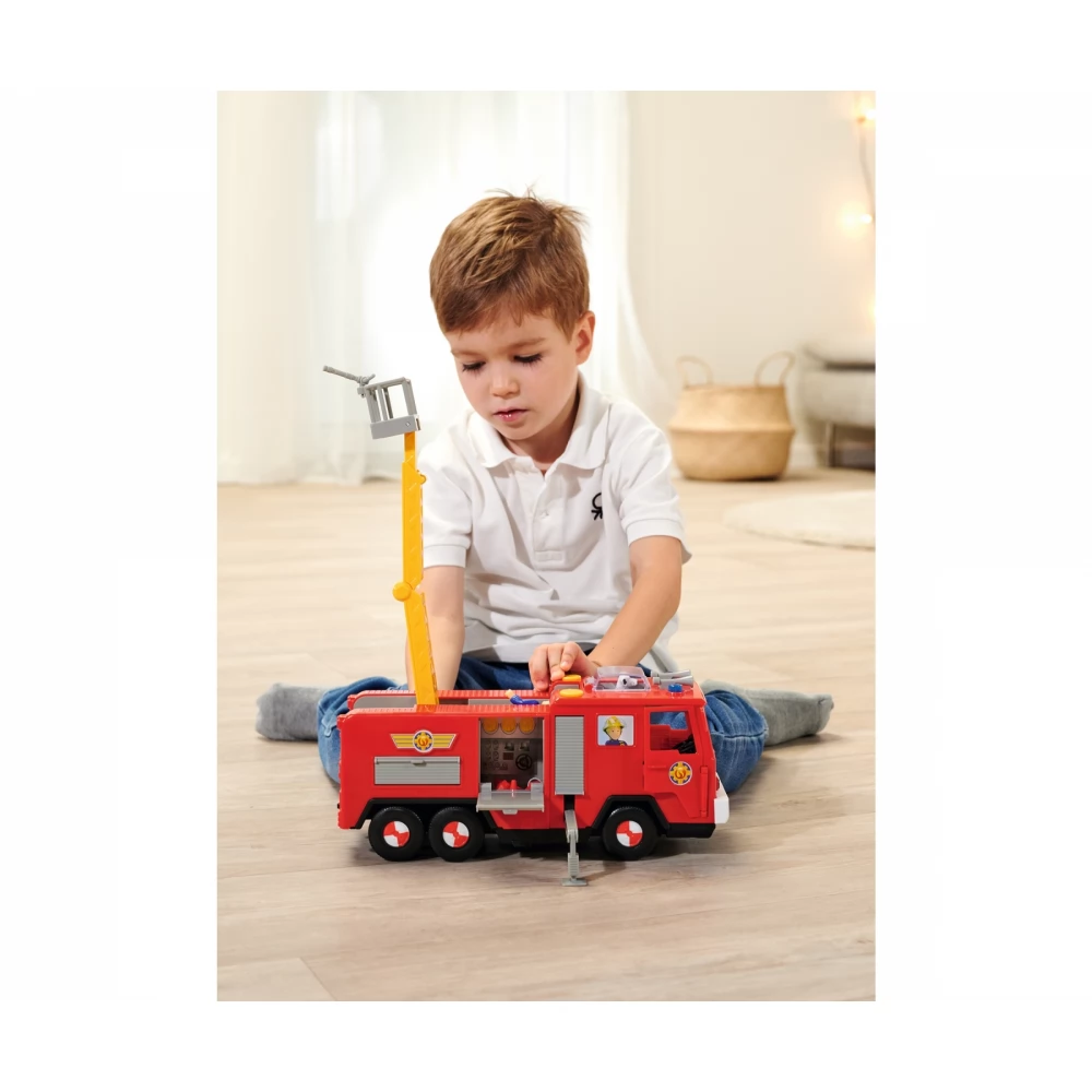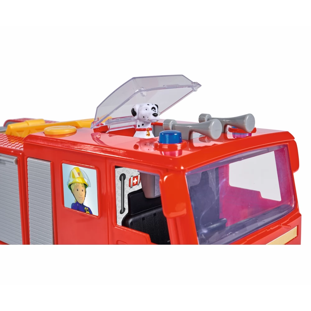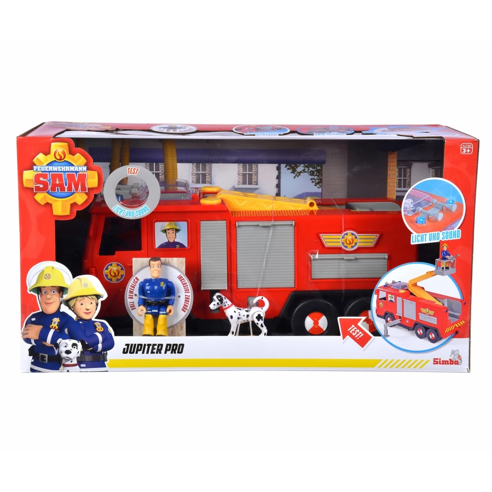 31cm-es Sam a tűzoltó Jupiter Pro tűzoltóautó hang és fényhatásokkal, kinyitható támasztékkal (a kocsi tetején lévő sárga gombokkal aktiválható), felemelhető-mozgatható kosaras karral, elülső kihúzható szerszám tartóval és felnyitható kémlelő nyilassal.