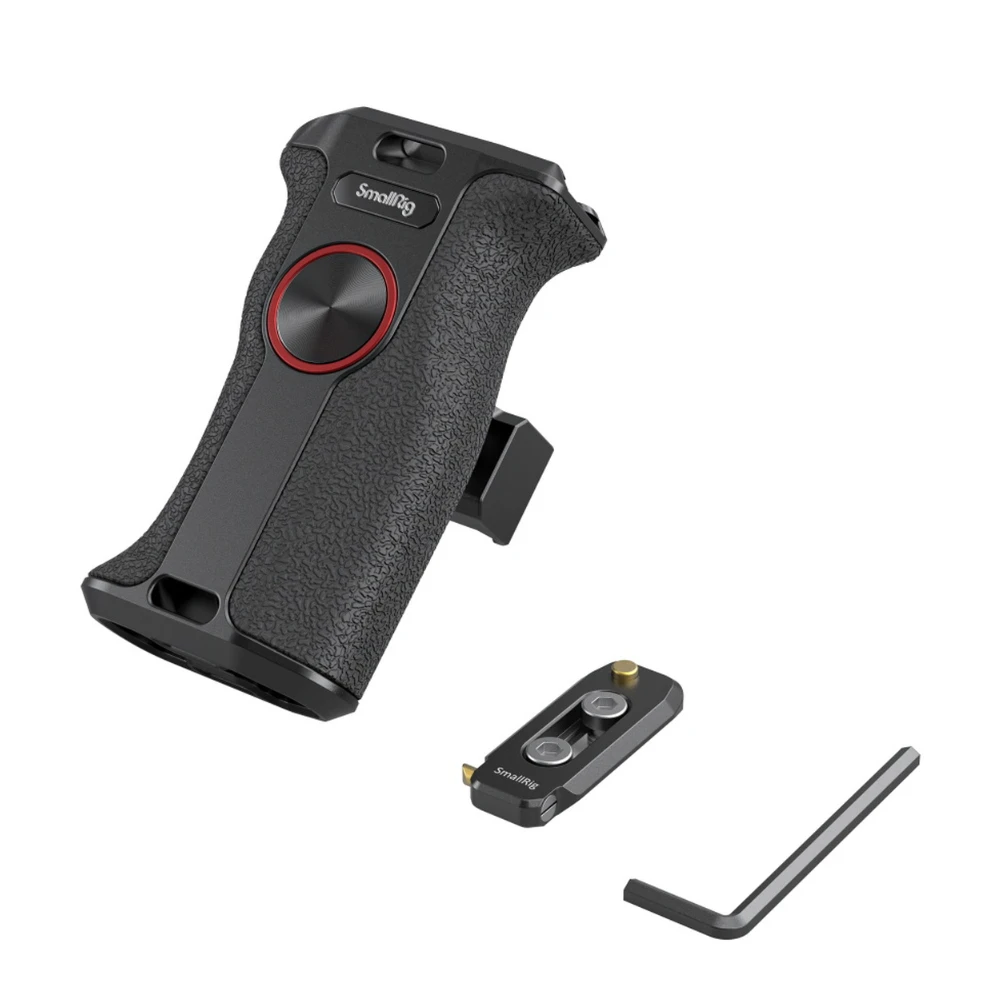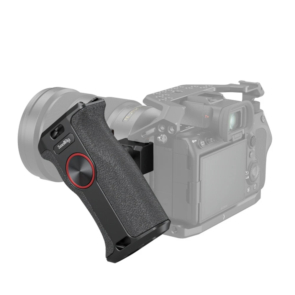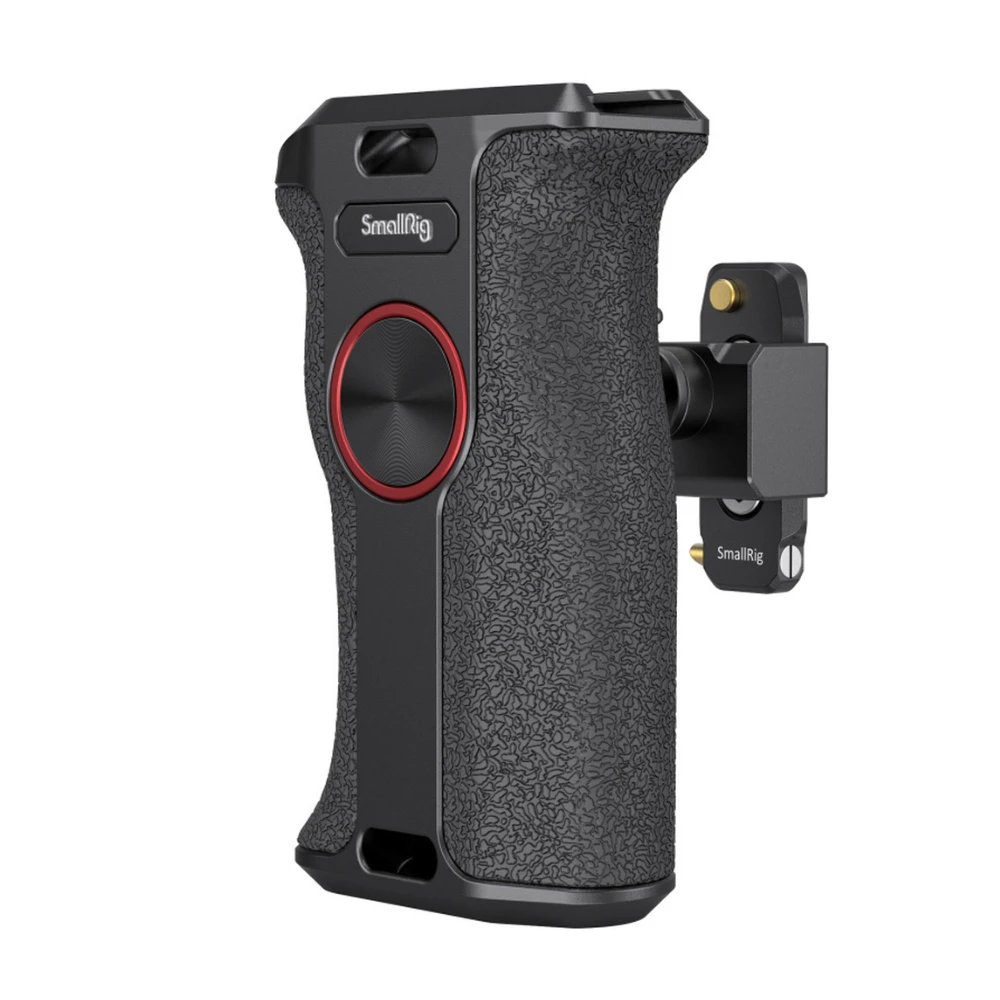 A NATO SmallRig (bal oldali) 3260 forgatható markolat a kamera felvételi szögének egyszerű beállítására szolgál. Az ergonomikusan kialakított, kényelmes szilikon textúrájú fogantyú csúszásgátló és izzadásálló. A NATO bilincs segítségével gyorsan rögzíthető a cage oldalára. Feltéve, hogy egyes cage-ek nem rendelkeznek NATO-sínes interfésszel, a BUN2468 segítségével bővíthető a felhasználók igényeinek megfelelően, és kompatibilis a különböző cage-ekkel. A különböző forgási szögeknél az oldalsó feloldó gombot megnyomva könnyedén 360 fokban elforgathatja, majd az automatikus rögzítéshez feloldhatja. A markolat 1/4"-20 és 3/8"-16-os menetes furatokkal és egy vakusínnel rendelkezik a tartozékok egyszerű rögzítéséhez; a PAC2456 kézi hevederrel együttműködve több lehetőséget biztosít a felhasználók tartási kényelmének további fokozásához.