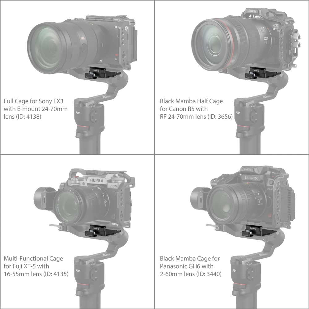 A SmallRig Arca-Swiss Mount Plate for DJI RS 3 Mini 4195-öt számos más kamera támogatására tervezték, mint például a Sony FX3 24-70 mm-es objektívvel, a Canon R5 24-70 mm-es objektívvel, a FUJIFILM X-T5 16-55 mm-es objektívvel és a LUMIX GH6 12-60 mm-es objektívvel, amelyek oldalról vagy felülről csúsztathatóak be. A rig segít gyorsan váltani a függőleges és vízszintes fényképezés között.