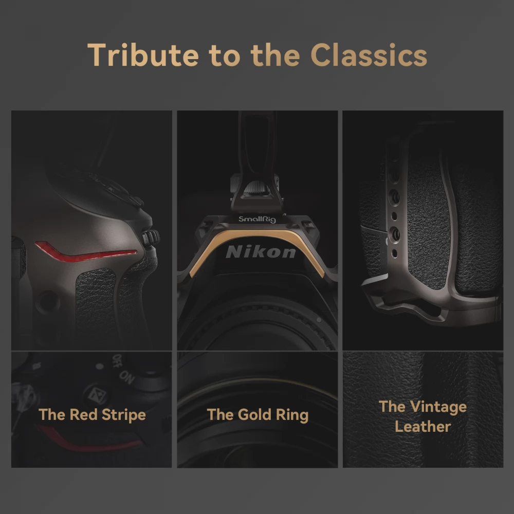 - Tökéletesen megismétli a Nikon Z 8 elemeit: az aranygyűrűt, a piros foltokat és a retro bőrt
