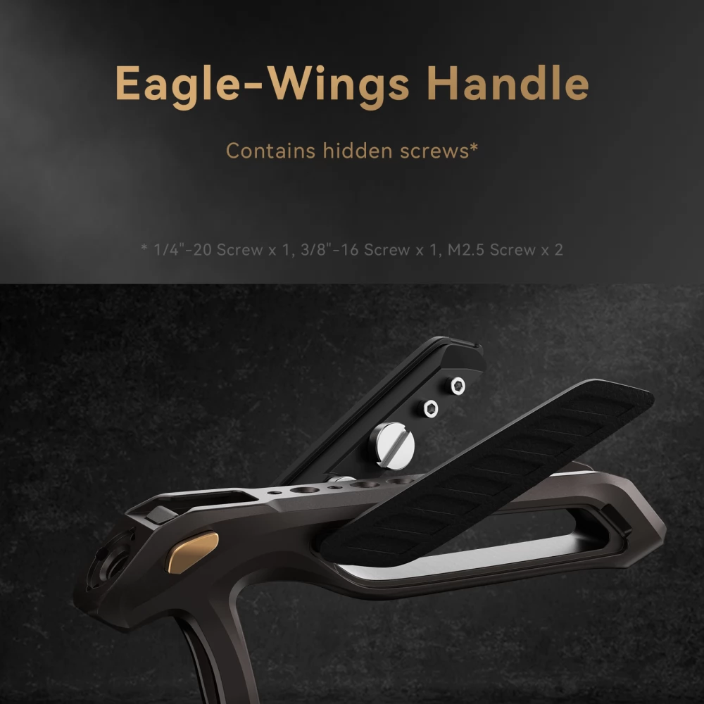 A SmallRig "Night Eagle" Cage Kit for Nikon Z 8 4317 lehetővé teszi a tartalomkészítők számára, hogy kényelmesen készítsenek felvételeket alacsony szögből, továbbá védi a kamerát, és számos kiegészítővel bővíti az interfészt. A kit tartalmaz egy cage-et, egy felső fogantyút, egy HDMI & USB kábelbilincset, és egy vakupapucsos rögzítőt. A cage vadonatúj dizájnnal rendelkezik: fegyverbarna ívek arannyal tarkítva, hogy kiegészítse a Nikon Z 8 klasszikus stílusát. A kábelbilincs új nyomd és billentsd kialakítása lehetővé teszi, hogy az interfész fedelét szétszerelés nélkül is felnyissa, így időt takaríthat meg. Ezenkívül megakadályozza a kábel véletlen leválasztását és stabil átvitelt biztosít. A levehető vakupapucsos rögzítő a cage mindkét oldalára és a tetejére is felszerelhető, és pozicionáló csappal van felszerelve az elhajlás megakadályozására. A levehető vakupapucsos rögzítővel segítségével rögzíthet LED videolámpát, mikrofont, stb. Az ergonomikus kialakítású fogantyú pedig kényelmes fogást biztosít, és tartalmaz egy rejtett 1/4"-20 csavart, 3/8"-16 csavart, és két M2,5 csavart. A kit számos beépített bővítőfelülettel rendelkezik, mint például 1/4"-20 menetes furat, 3/8"-16 menetes furat, ARRI 3/8"-16 helymeghatározó lyuk, vakupapucsos tartó, NATO-sín, Arca-Swiss gyorskioldó lap, QD port, stb. Támogatja a varázskarokat ("magic arm"), oldalfogantyúkat, felső fogantyúkat, rúdbilincseket, alsó lemezeket, LED videólámpákat, mikrofonokat stb.
