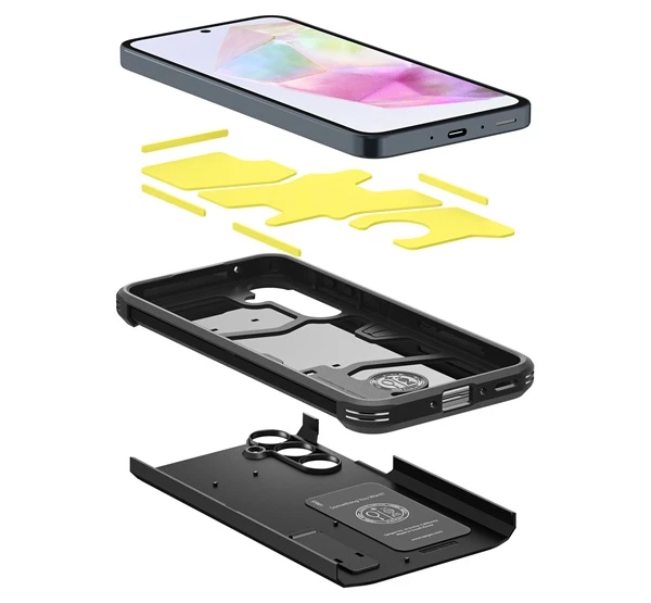 A Spigen Tough Armor tok a Samsung Galaxy A55 5G (2024) készülékhez készült, maximális védelmet nyújtva a mindennapi használat során. A kétrétegű szerkezet kemény külső burkolatot és rugalmas belső réteget kombinál, amelyek együttesen hatékonyan elnyelik az ütések és esések energiáját.