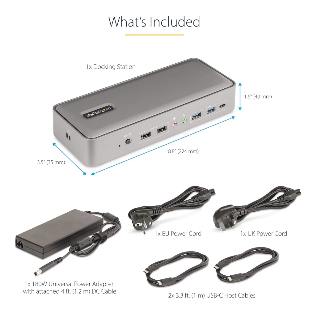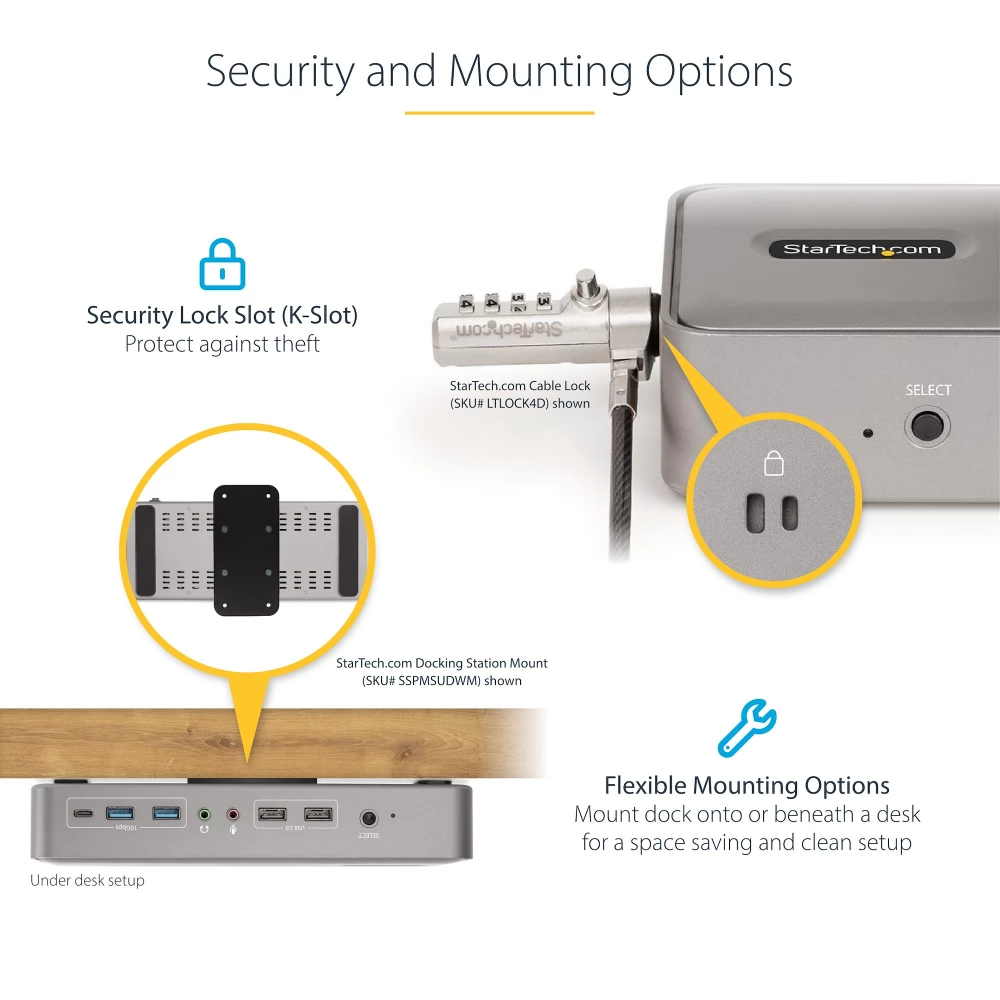 - CSATLAKOZTATÁS: A dokkoló számos porttal rendelkezik az eszközök csatlakoztatásához; 2x USB 2.0 Type-A HID, 2x USB-A (10 Gbps), USB-C (10 Gbps), 2x DisplayPort, 2x USB-C gazdagép port, Gigabit Ethernet, 3,5 mm-es sztereó hang, 3,5 mm-es mikrofon, 2x K-Slot ( Standard/nano)
