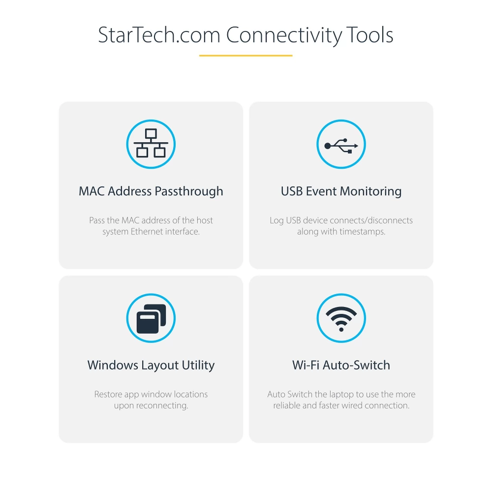 - ELŐNYÜNK: Tartalmazott csatlakozási eszközök az IT Pro-k és az IT-súgószolgálati csapatok számára hálózati MAC-cím áteresztéssel a hálózat biztonságáért, WiFi automatikus átkapcsolással a jobb hálózati teljesítményért, USB-eseményfigyeléssel és Windows-elrendezéssel