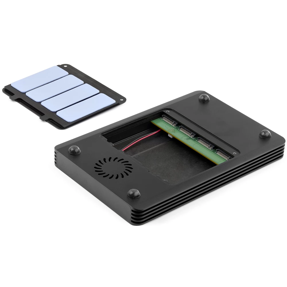 M2E4BTB3 4x M.2 NVMe SSD 2x Thunderbolt 3 külső ház fekete színben, 1x DisplayPort csatlakozóval.