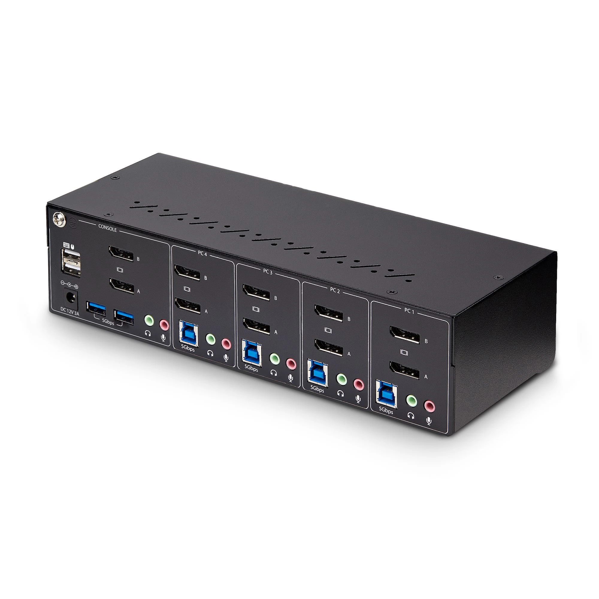 Ez a kétmonitoros KVM kapcsoló lehetővé teszi a felhasználók számára, hogy négy olyan asztali számítógép között váltsanak, amelyek USB-A és DisplayPort-kompatibilisek. Lehetővé teszi a kettős 4K 60 Hz-es DisplayPort monitorok, a billentyűzet és az egér, valamint a két 5Gbps USB-eszköz megosztását.