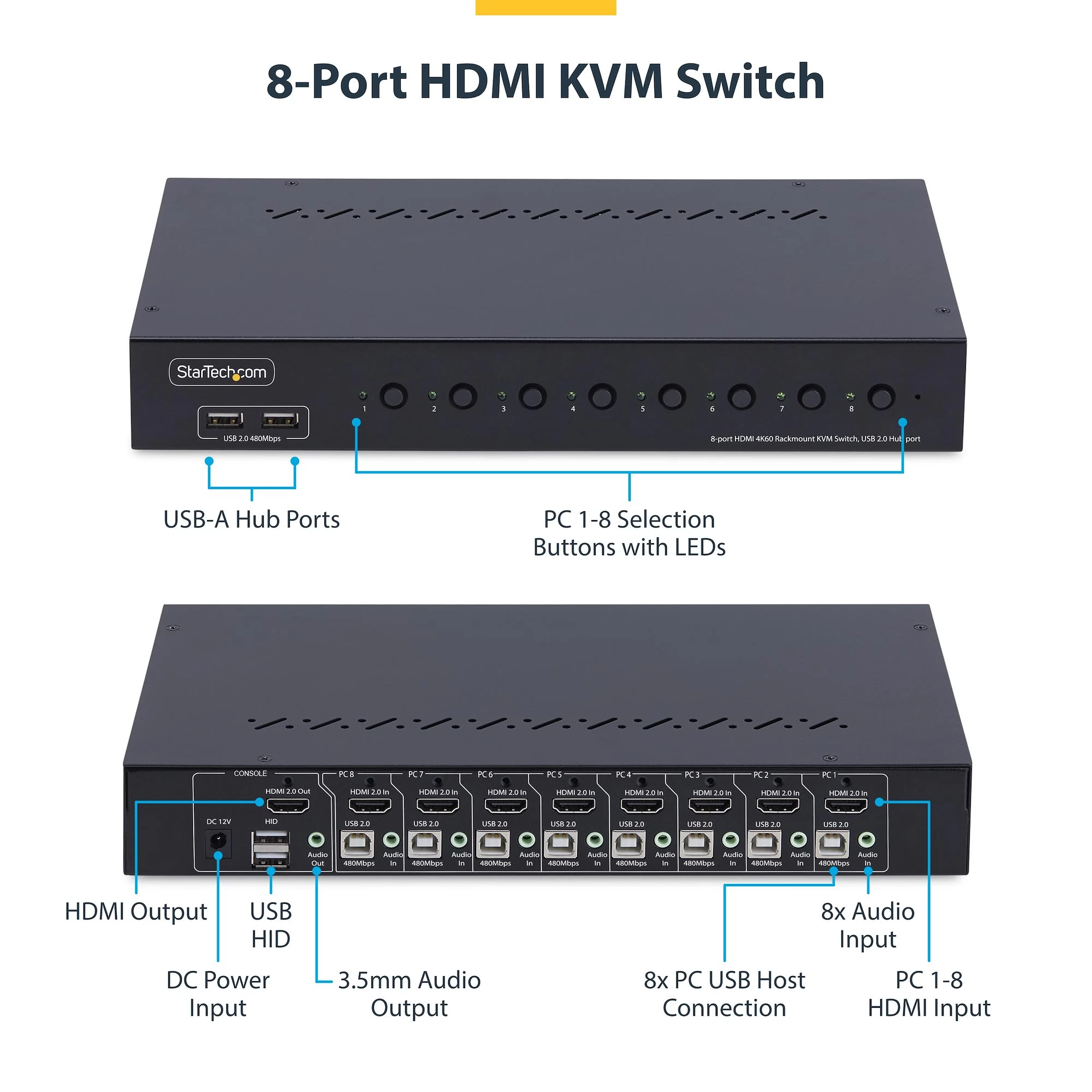A 4K 60Hz-es rackbe szerelhető KVM kapcsoló lehetővé teszi nyolc HDMI-képes számítógép közötti váltást, egy billentyűzet, egér, hangeszköz, 4 portos USB 2.0 hub és egy 4K 60Hz-es HDMI 2.0 monitor megosztását. Ez lehetővé teszi a többrendszerű rendszer egyszerű kezelését, a jobb munkaterület-hatékonyságot és a fokozott termelékenységet.