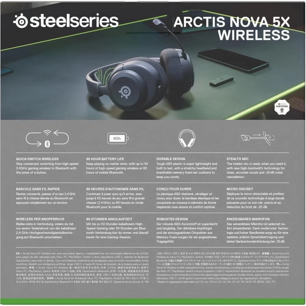 A SteelSeries Arctis Nova 5X olyan játékosok számára készült, akik komolyan gondolják ezt, és nem akarnak kompromisszumot kötni a hangminőség, a kényelem és az akkumulátor élettartama terén. A kísérőalkalmazással több mint 100 gaming hangbeállítás közül választhatsz, amelyet az éppen játszott játékhoz igazíthatsz. A SteelSeries Arctis Nova 5X gaming fejhallgató akkumulátora akár 60 órát is bír, és mindössze negyed óra USB-C-n keresztüli töltés után további 6 órányi használat áll a rendelkezésedre. A Quick-Switch Wireless funkciónak köszönhetően könnyedén válthatsz a 2,4 GHz-es és a Bluetooth kapcsolatok között, így problémamentesen kezelheted a bejövő hívásokat a mobiltelefonodon. A csapattársakkal való problémamentes kommunikációt az új ClearCast mikrofon biztosítja, amely használaton kívül simán behelyezhető a fülkagylóba. A SteelSeries Arctis Nova 5X többplatformos gaming fejhallgató felbecsülhetetlen értékű szövetségese lesz minden játékosnak.