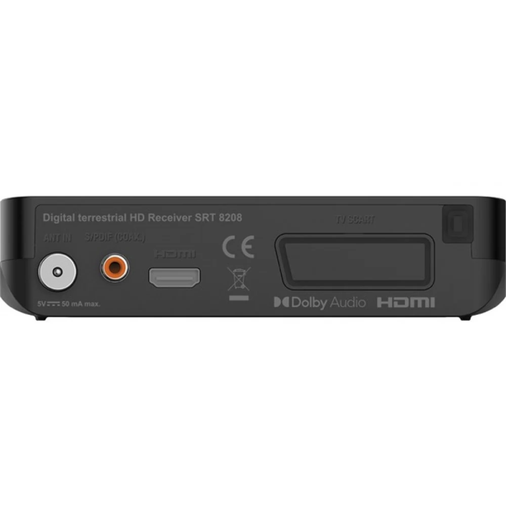 Az SRT8208 egy kicsi és hatékony Nagyfelbontású földfelszíni digitális vevőkészülék, DVB-T2 a szabadon fogható adások vételére kültéri vagy beltéri antennával. Többnyelvű és a nagyfelbontású OSD menüvel. Az Elektronikus műsorújság (EPG) segítségével követheti az eseményeket akár 7 napra. A kényelmi funkciók, mint a bekapcsolás az utoljára nézett csatornán, kedvencek listák, szülői felügyelet, gyors és egyszerű telepítés remek választást biztosít a szórakozáshoz.